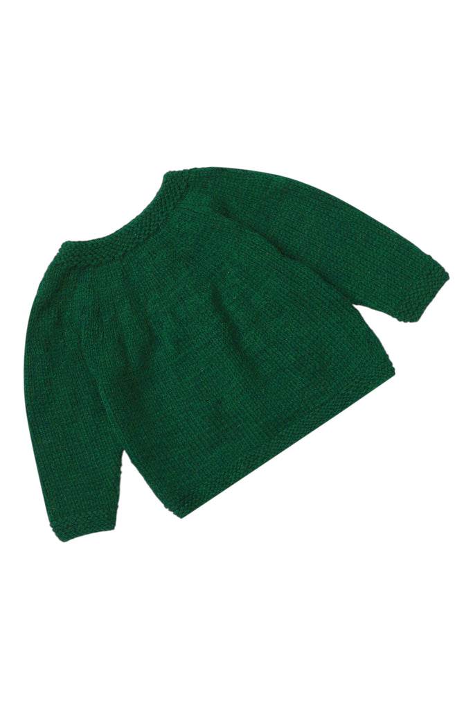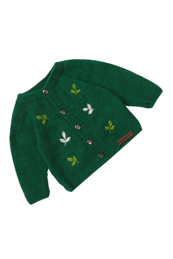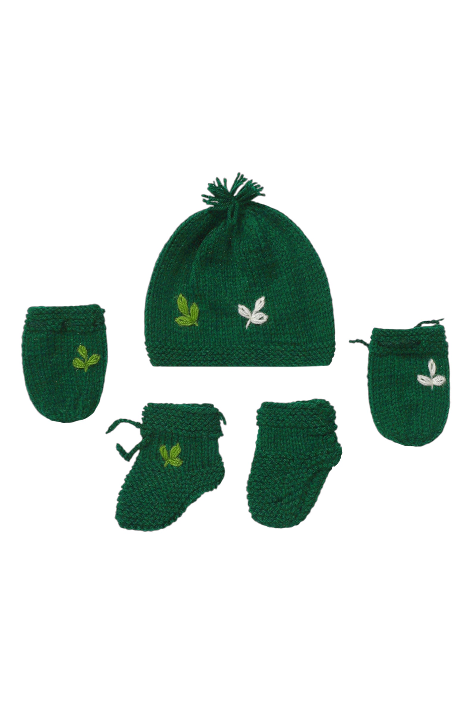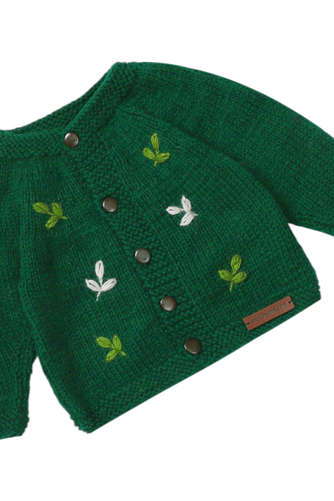 A rich bottle green hand-knitted sweater set, adorned with delicate leaf embroidery that brings a touch of nature’s elegance. Handmade with love by skilled artisans, this set includes a warm sweater, matching cap, and booties—keeping your baby cozy while adding a timeless, earthy charm to their winter wardrobe.