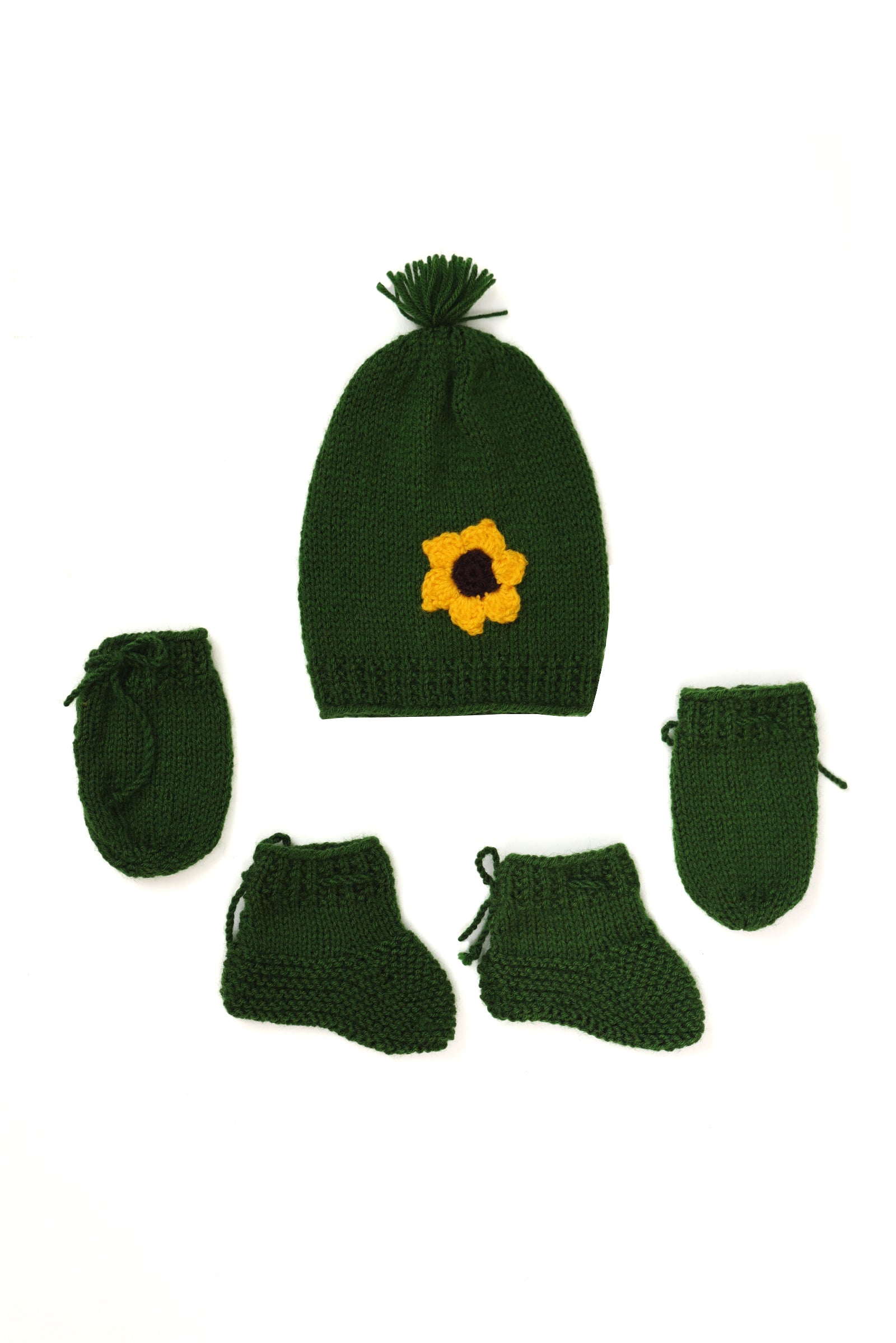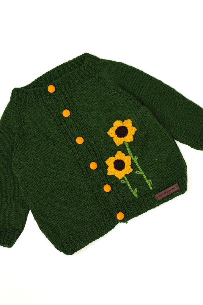 A cosy brown hand-knitted front-open sweater set featuring playful colorful balloons on one side and a fluffy cloud on the other. Comes with matching cap, socks, and mittens for complete comfort and cuteness.
