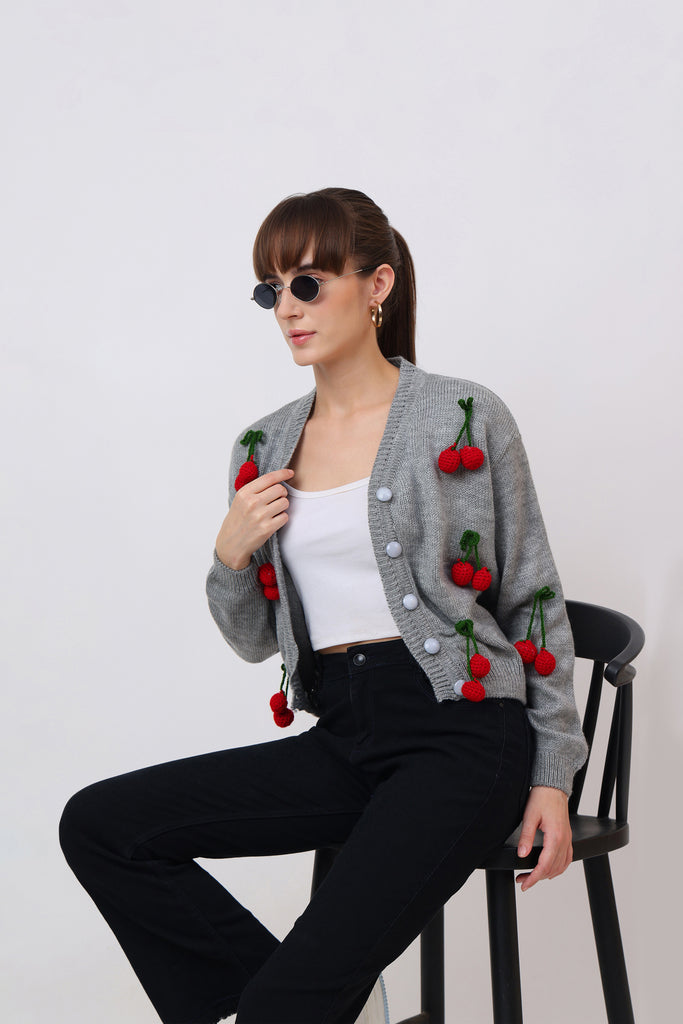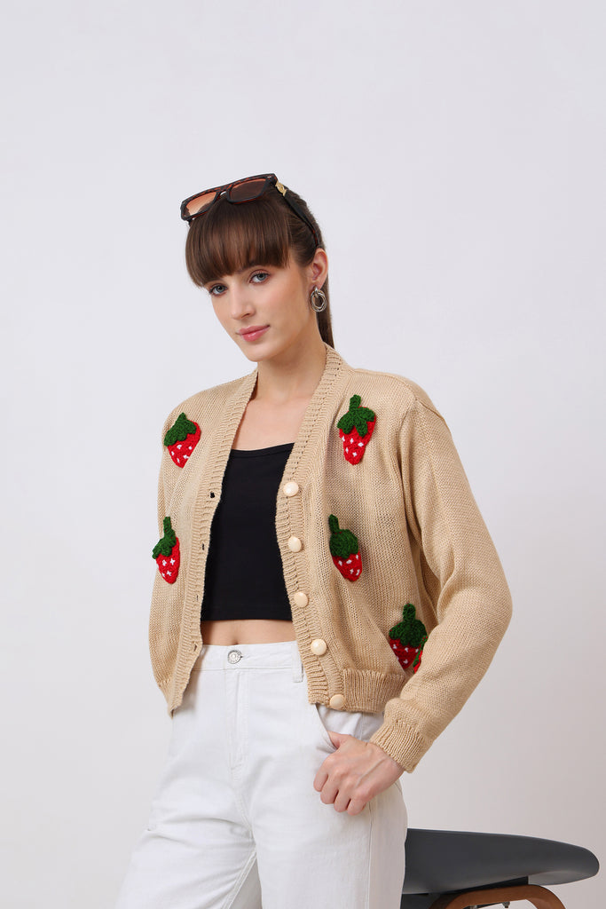 Berry Bloom Cardigan – Beige with Red Strawberry Appliqué