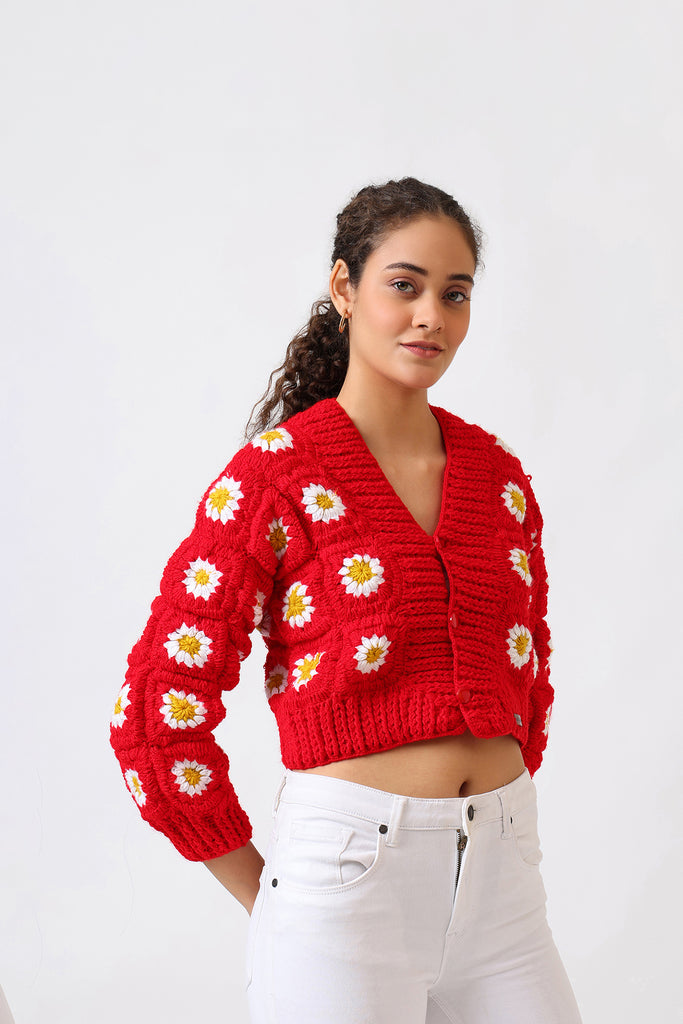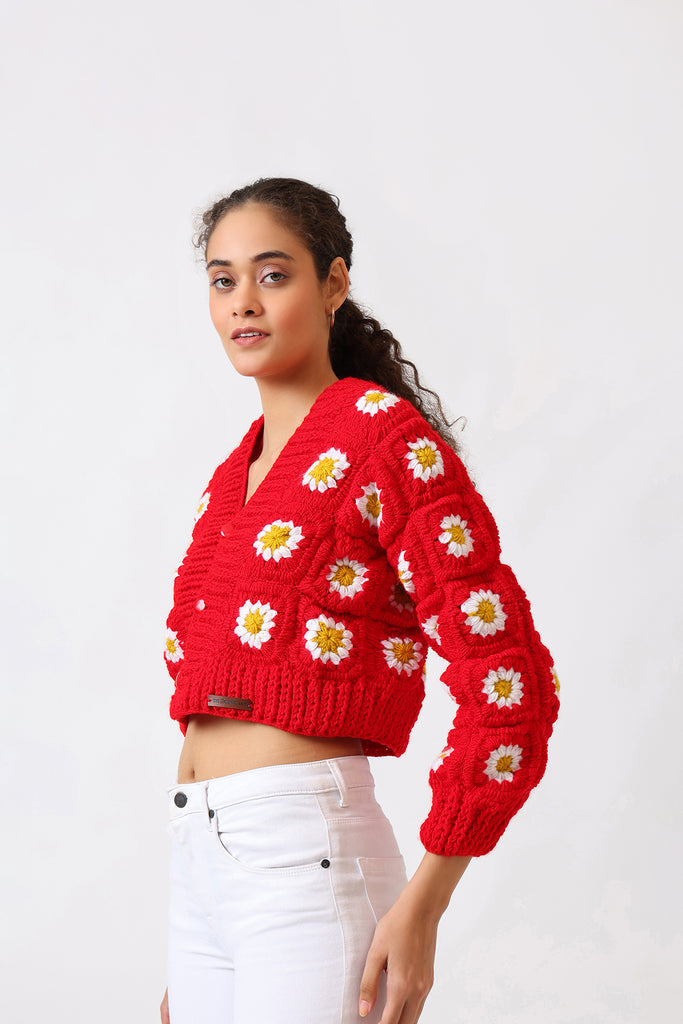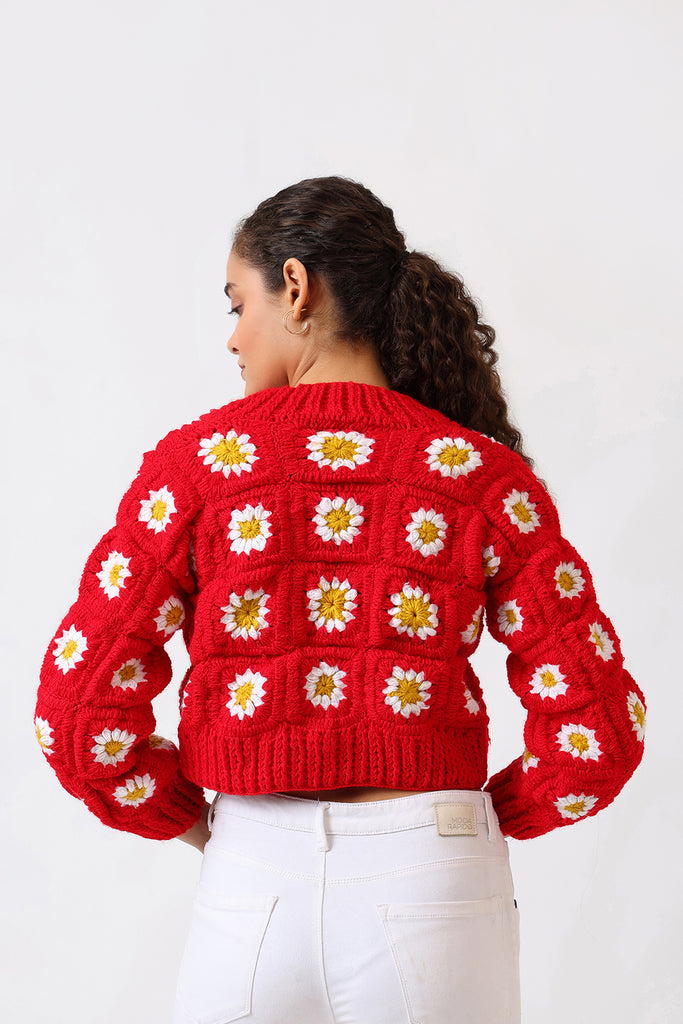 Turn heads and own the spotlight in our Retro Riot Cardigan — a bold burst of color, craft, and confidence. Hand-crocheted using the traditional granny square technique, each block is a little universe of joy stitched together in fiery red and rainbow shades.