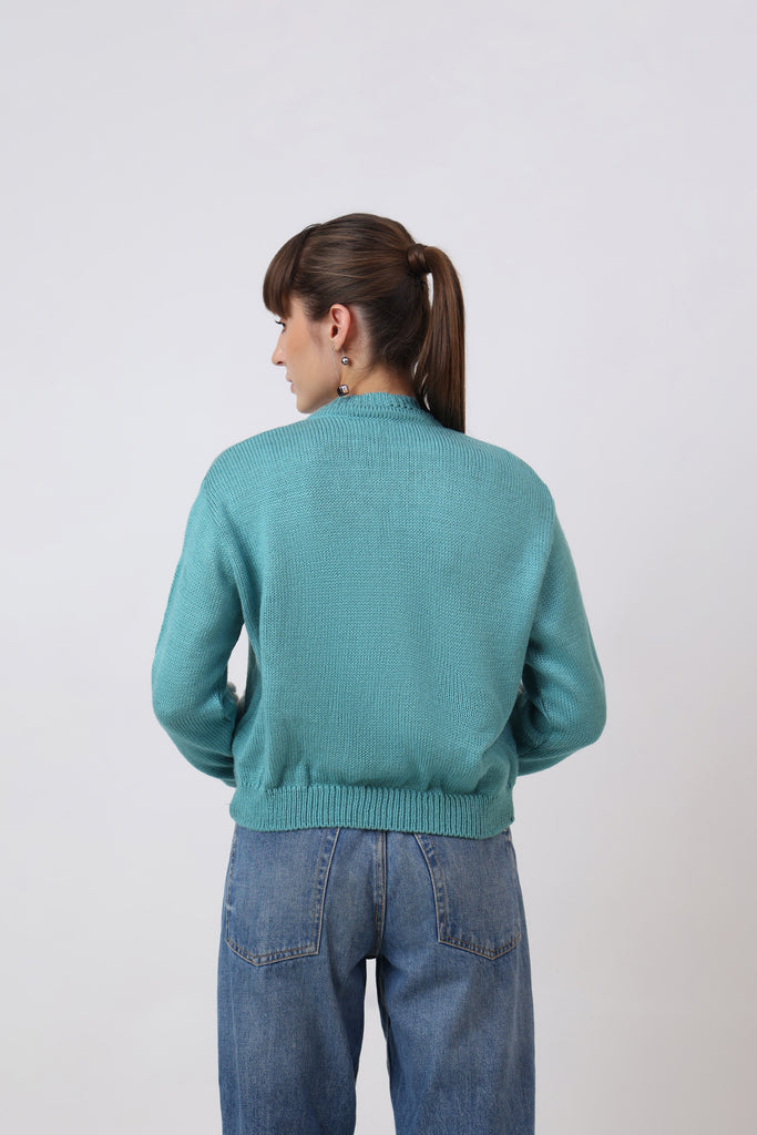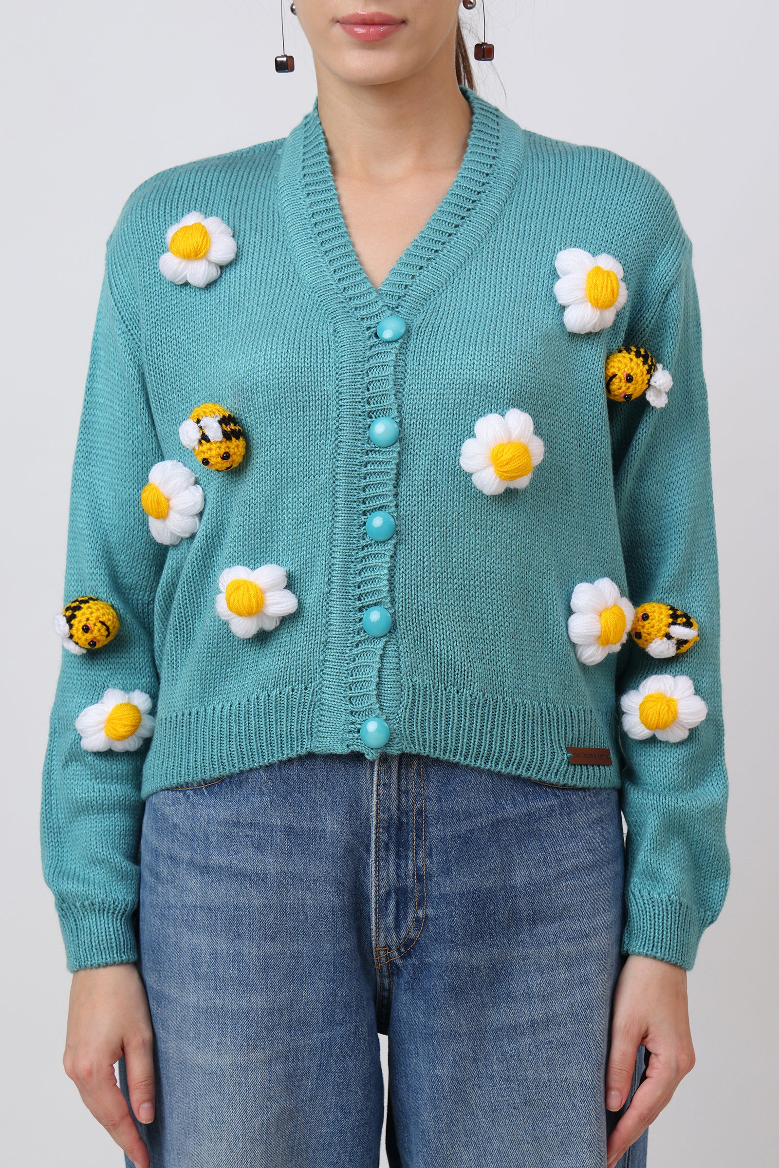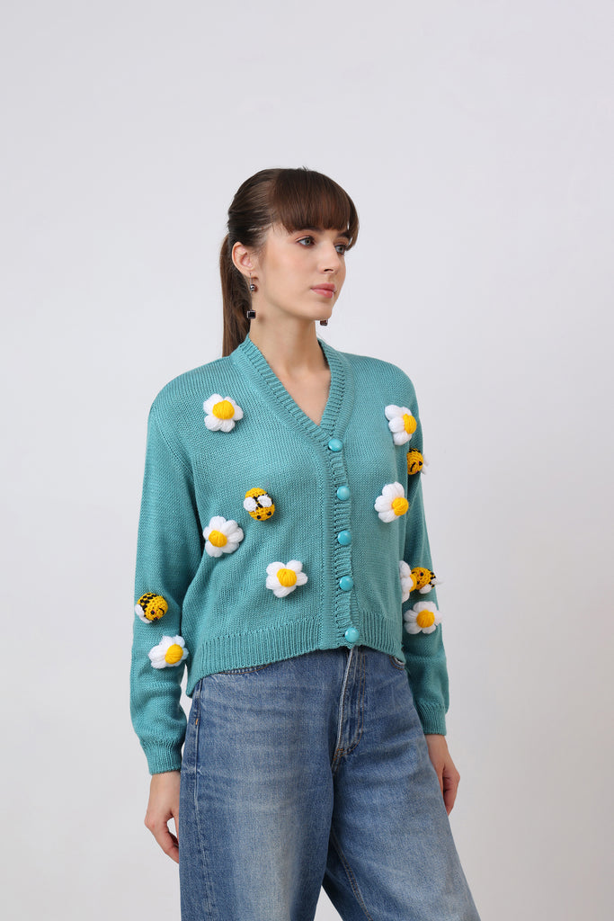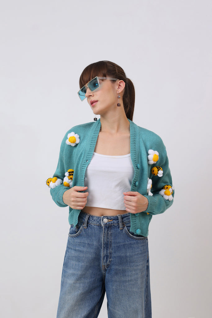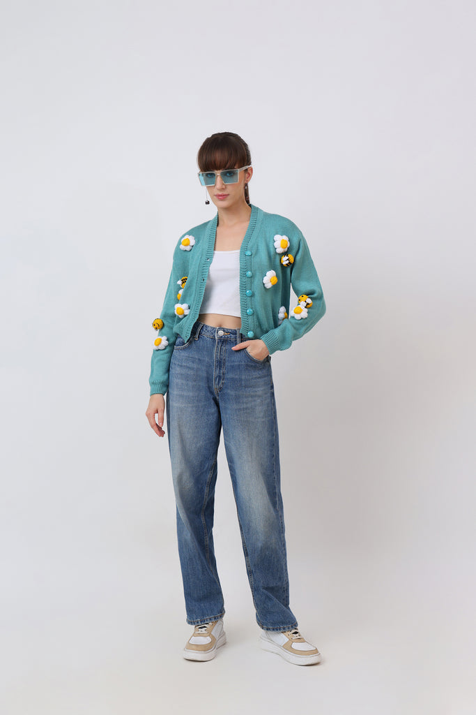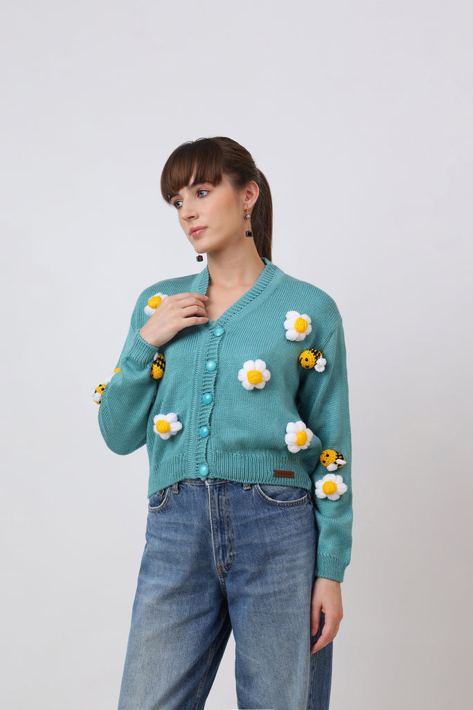 Fresh and full of charm, this cyan adult cardigan is adorned with crochet honeybees and delicate flowers. The bright cyan base brings a lively backdrop for the detailed appliqués, creating a cheerful and nature-inspired design. Cozy, stylish, and crafted with care, this cardigan is perfect for adding a playful yet elegant touch to your wardrobe. A piece that celebrates creativity, comfort, and the beauty of handmade art.