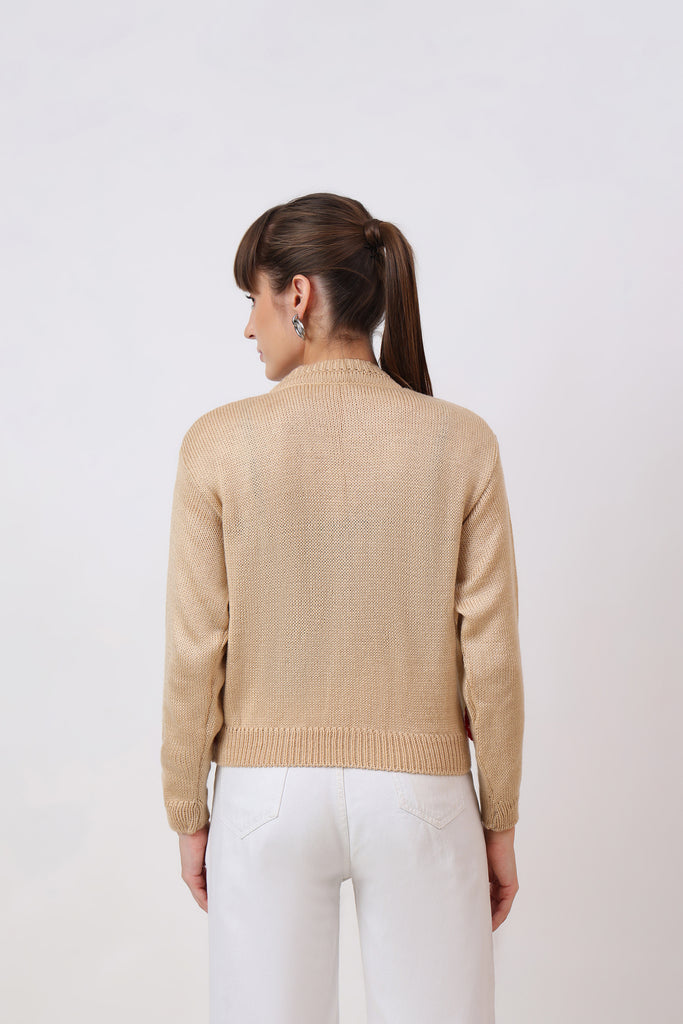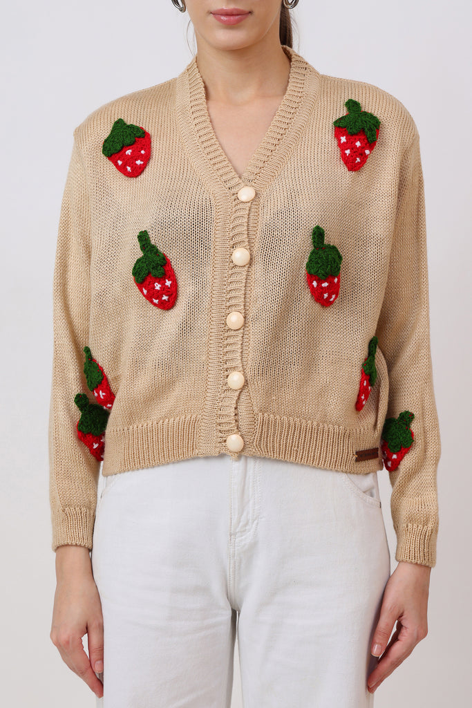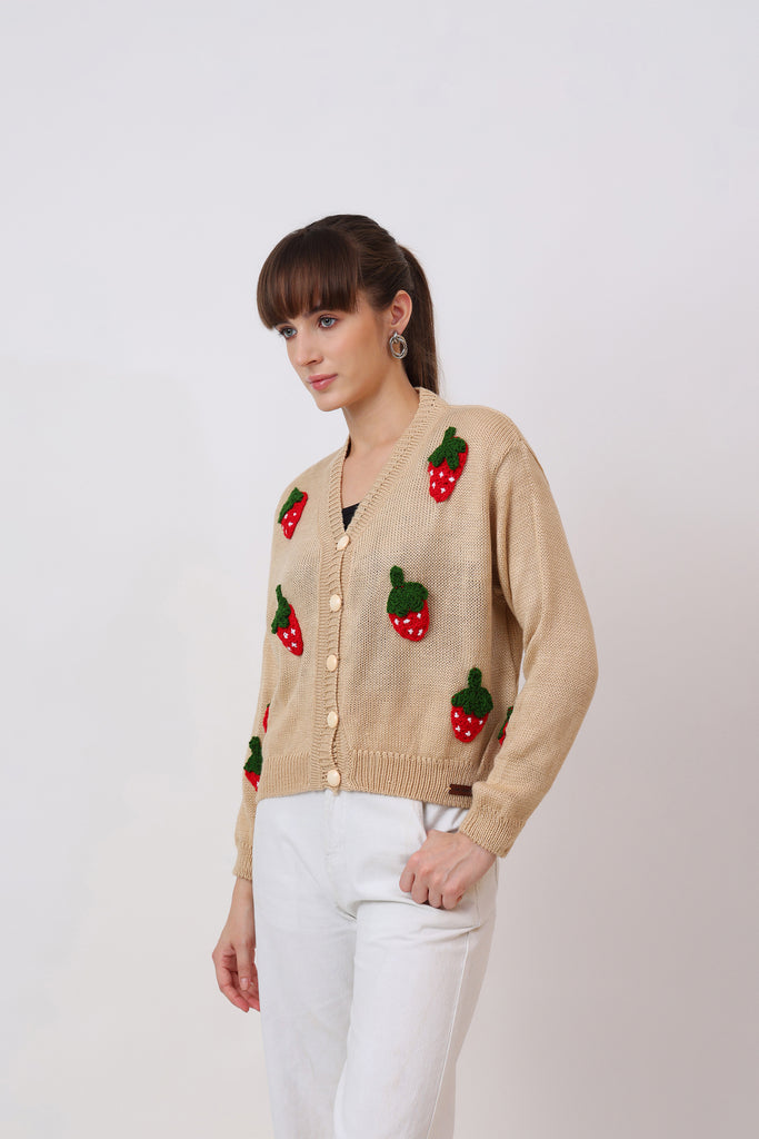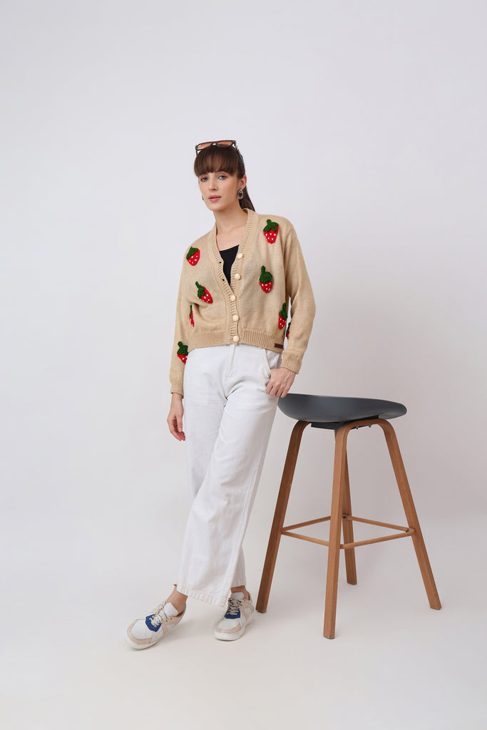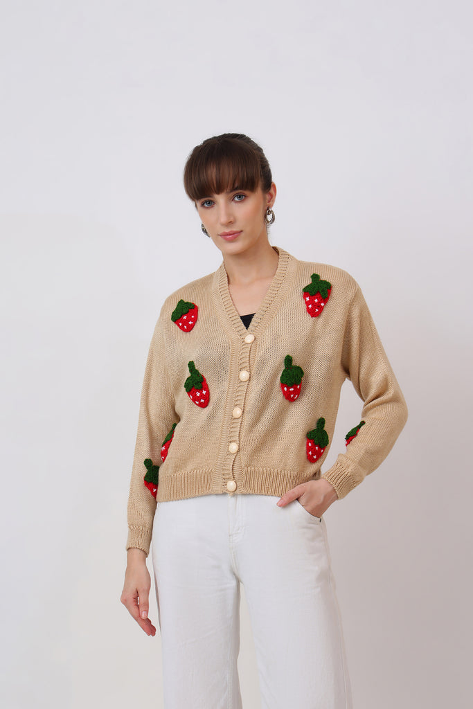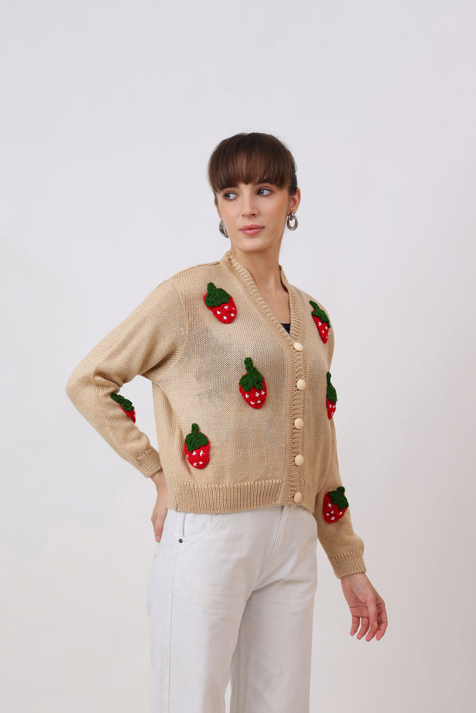 Playful meets elegant in this beige cardigan, embellished with vibrant red crochet strawberry appliqués. Designed for all-day comfort, it adds a quirky, youthful twist to a classic neutral. Lightweight, cozy, and crafted with care, this cardigan is perfect for layering — whether you’re heading to work, college, or a casual day out. A statement piece that blends timeless craftsmanship with fresh, fun charm