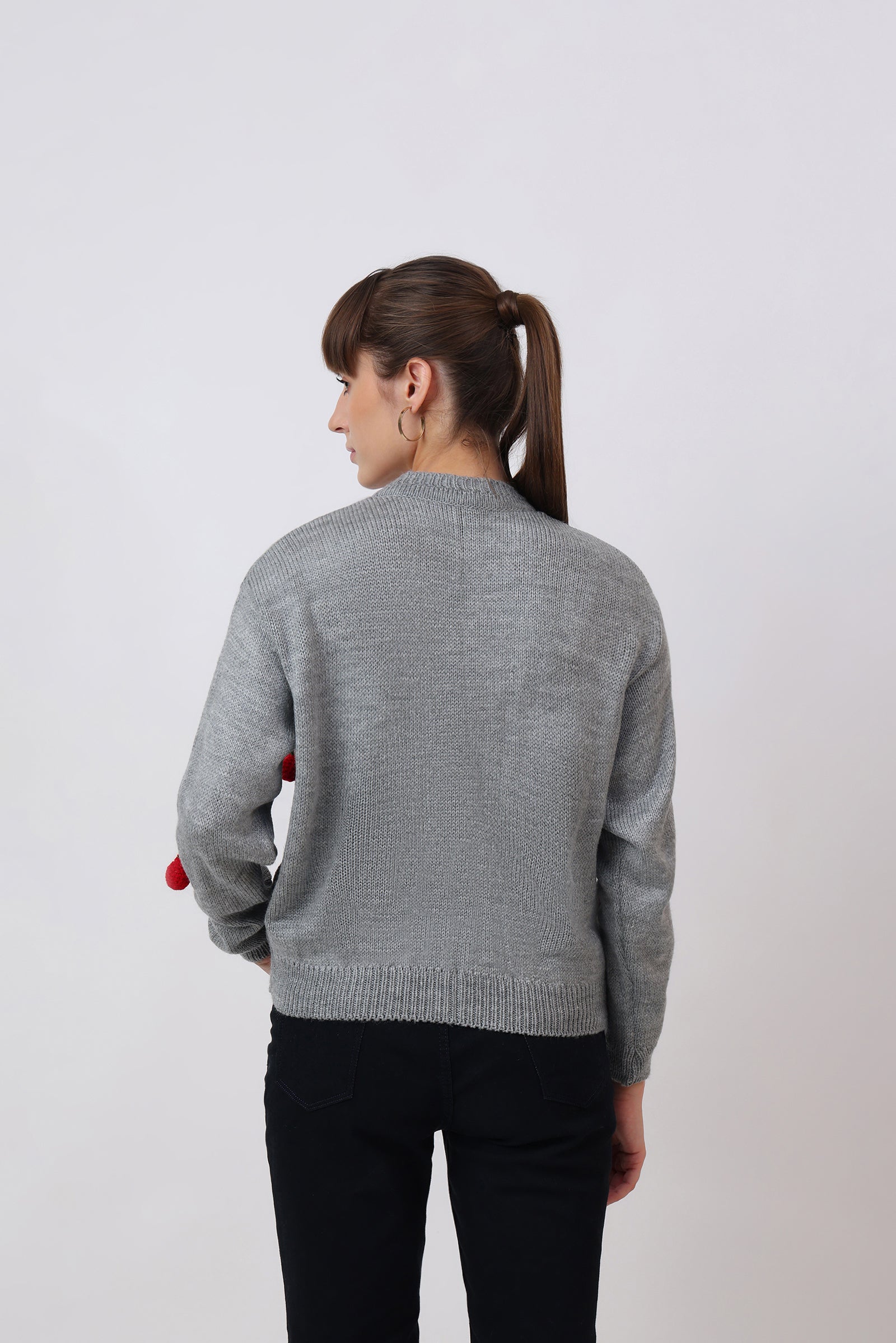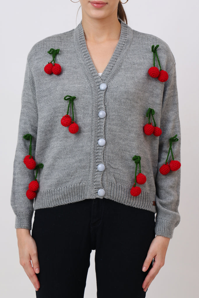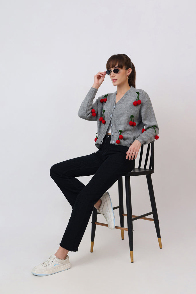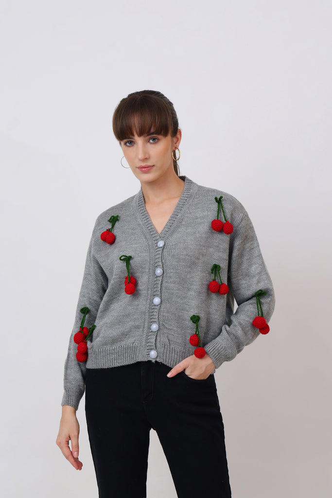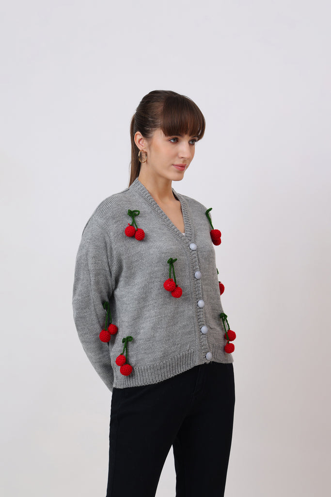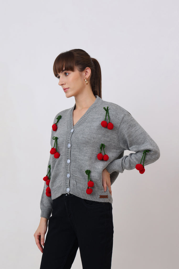 Elegant yet playful, this grey adult cardigan is accented with delicate hanging cherry crochet appliqués. The subtle grey base makes it versatile and easy to style, while the bright cherries add a pop of colour and fun. This cardigan is soft, cozy, and perfect for layering — a timeless piece that balances everyday comfort with a cheerful, artisanal touch.Material: 100% Acrylic Yarn