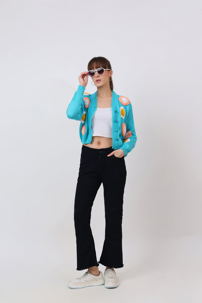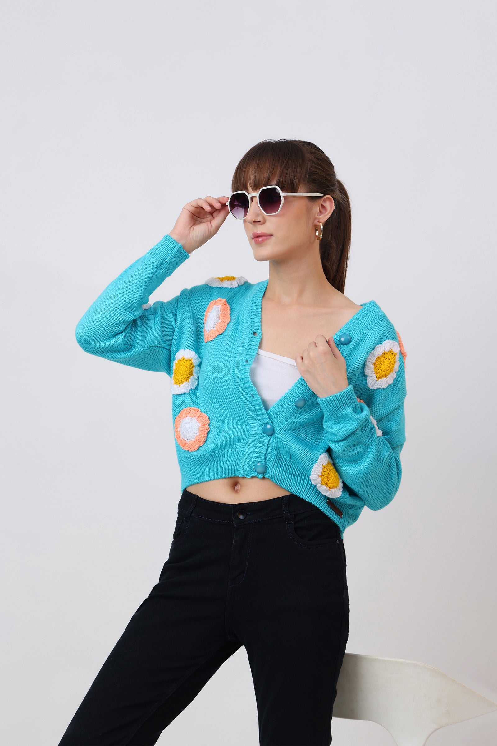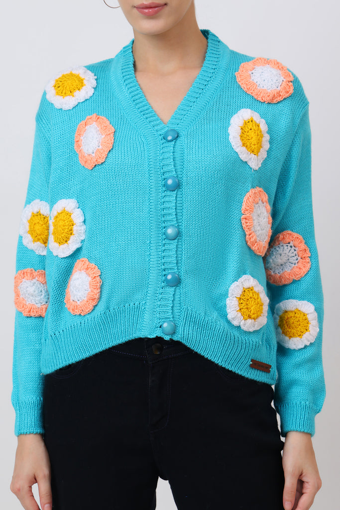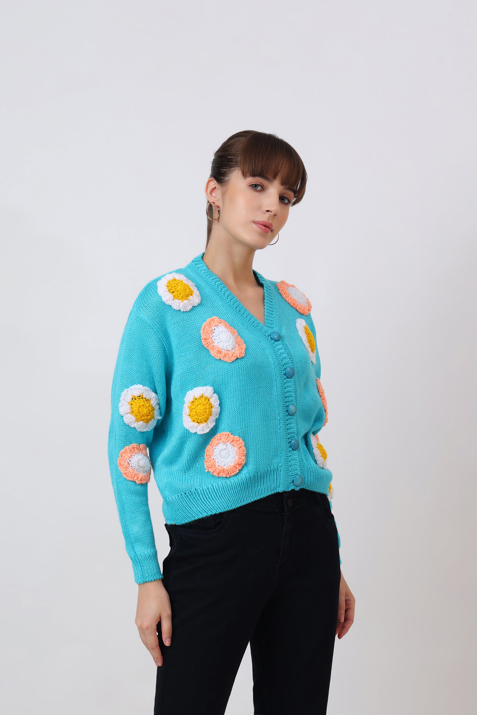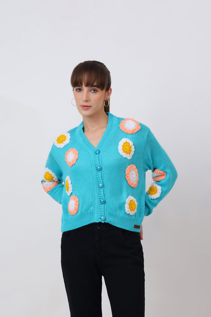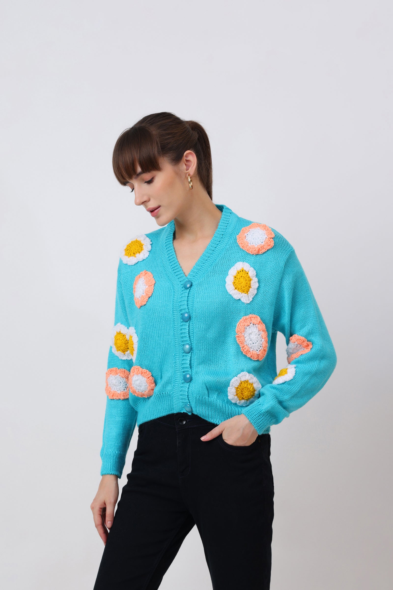 Make a bold yet graceful statement with this sea green adult cardigan, decorated with big, colourful crochet flower appliqués. The lively floral accents stand out beautifully against the soft sea green base, giving the cardigan a fresh, artistic charm. Cozy and stylish, it’s the perfect layering piece to add vibrance and personality to your everyday wardrobe. A true blend of comfort, creativity, and timeless appeal.