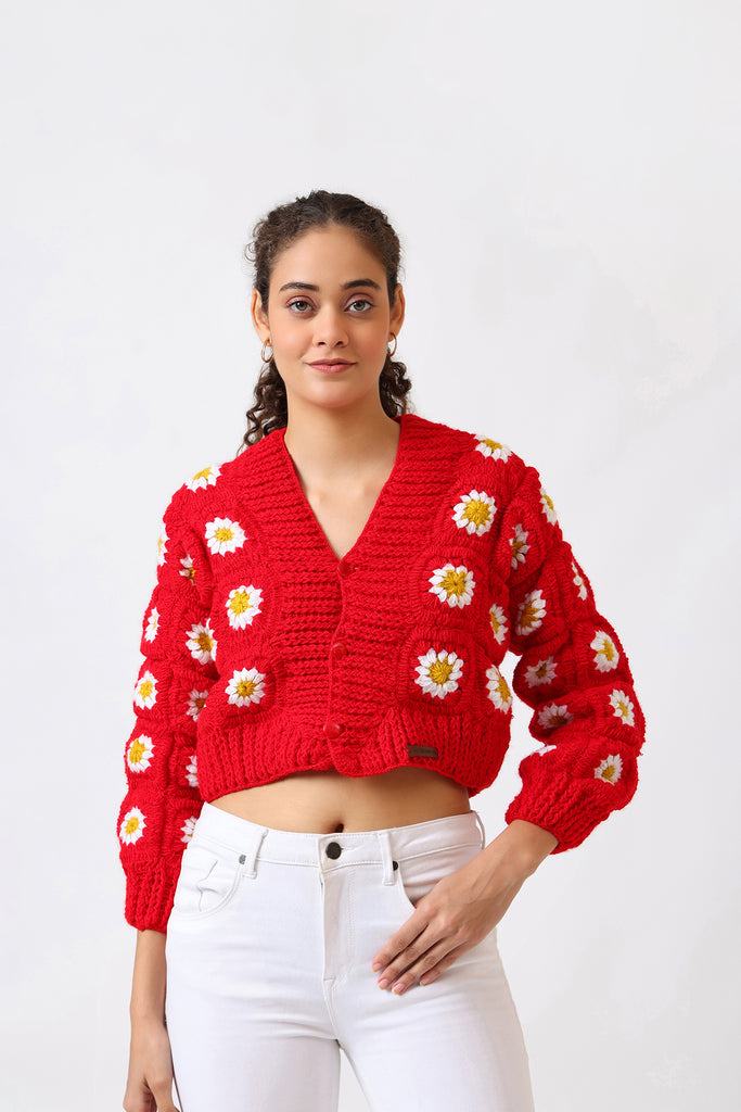 Floral Pop – Pink Cardigan with Chunky Handmade Blooms