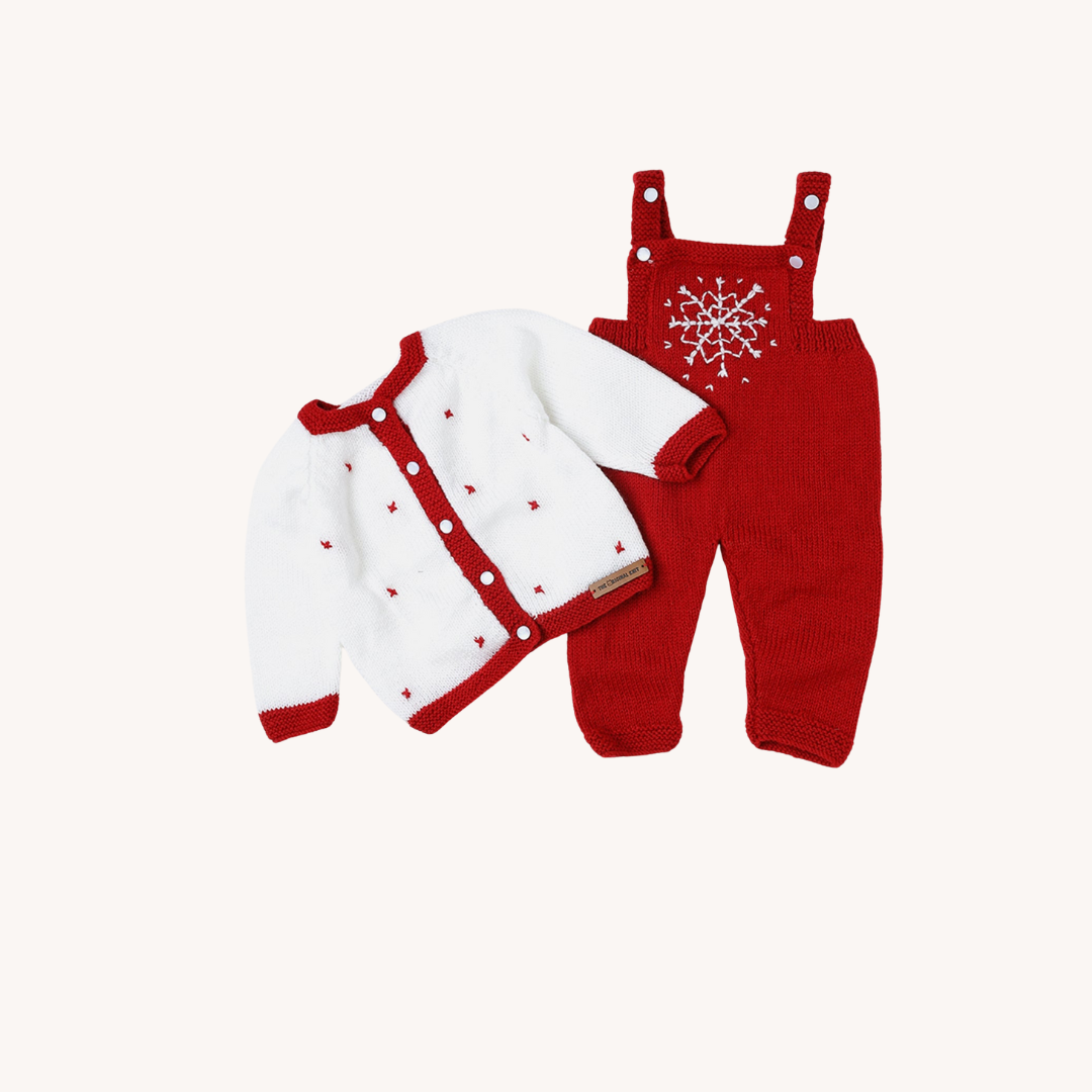 Red & White, Handmade Self Design Sweater set with Dungaree/ Pyjama Sweater has round neck, long sleeves, button closure, ribbed hem. Dungaree has buttons on both the sides for easy closure and best fitting.
