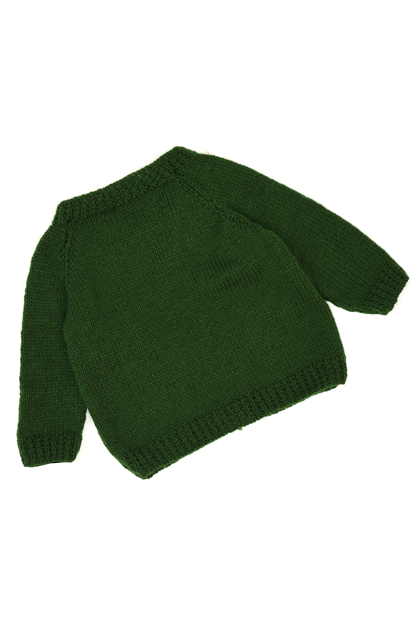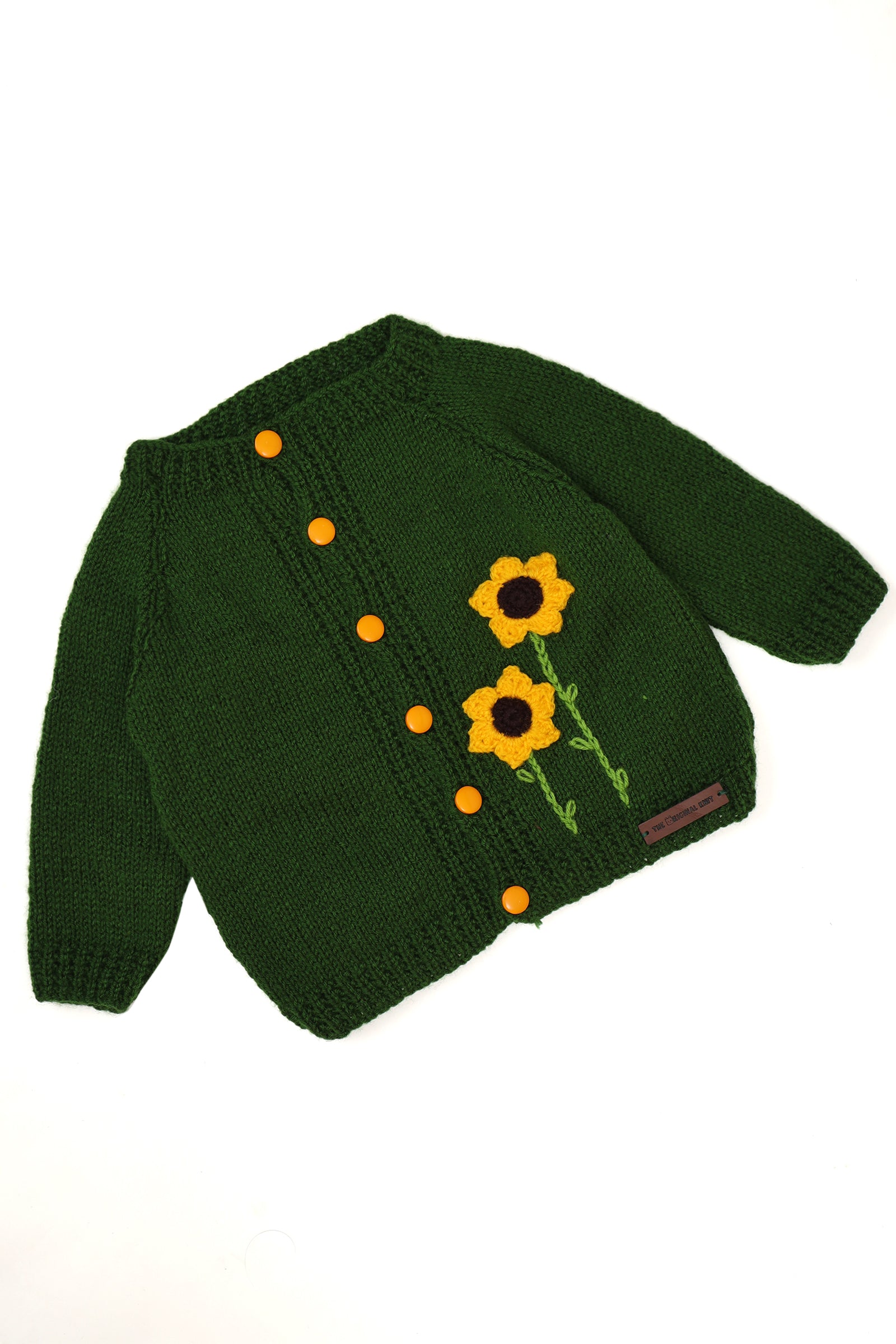 A cheerful hand-knitted sweater  featuring vibrant sunflower appliqués on one side of the sweater and a matching sunflower on the cap.