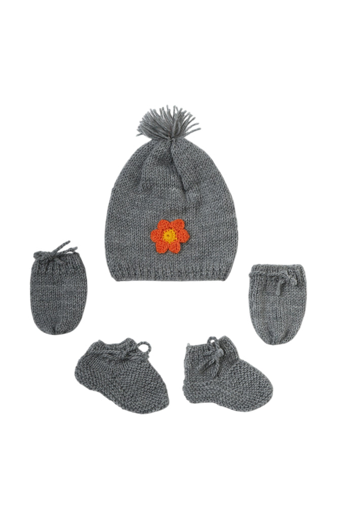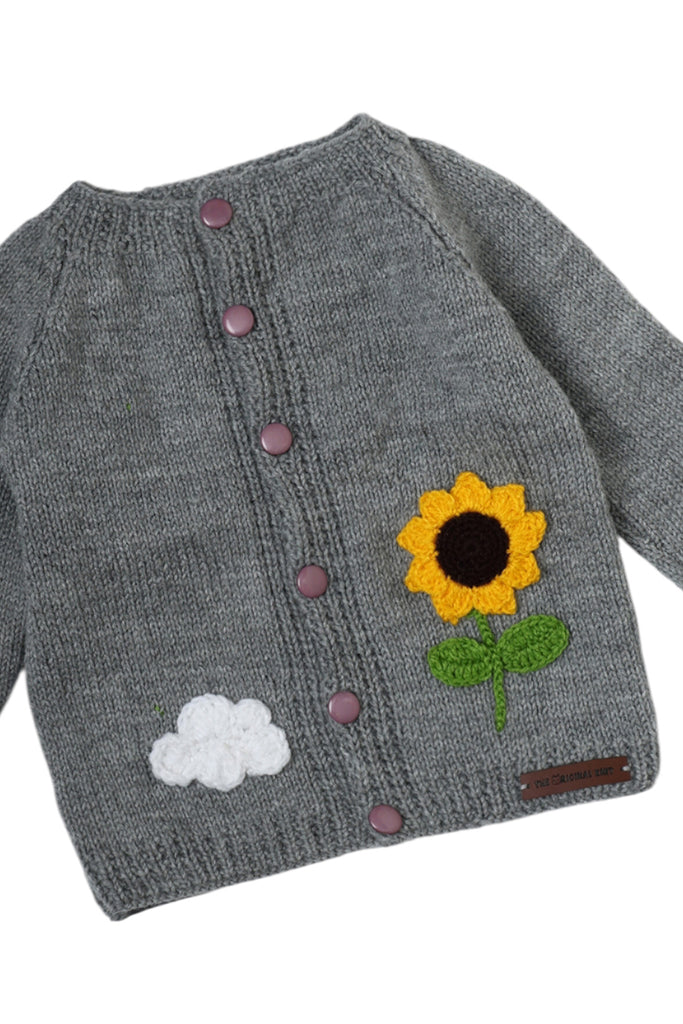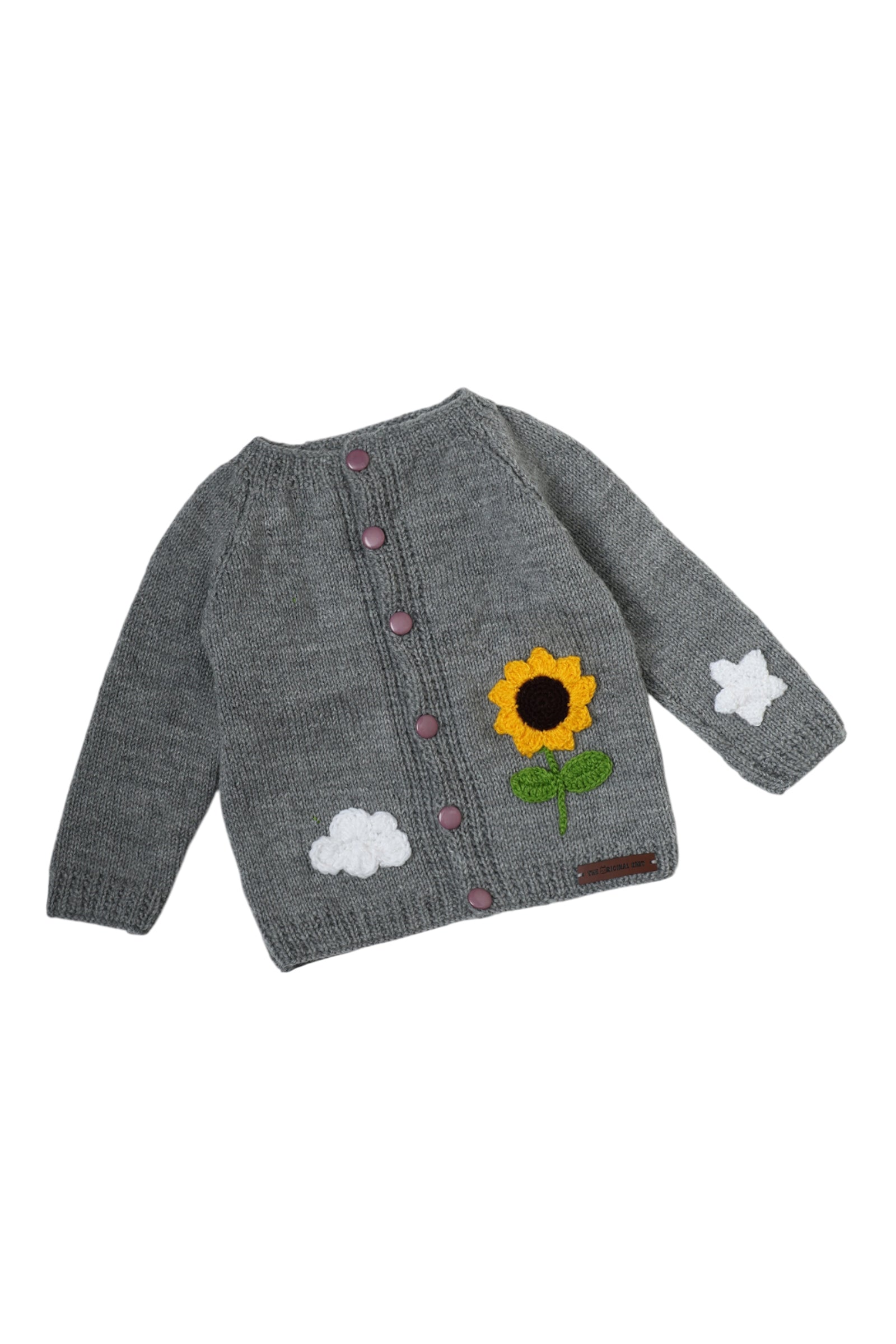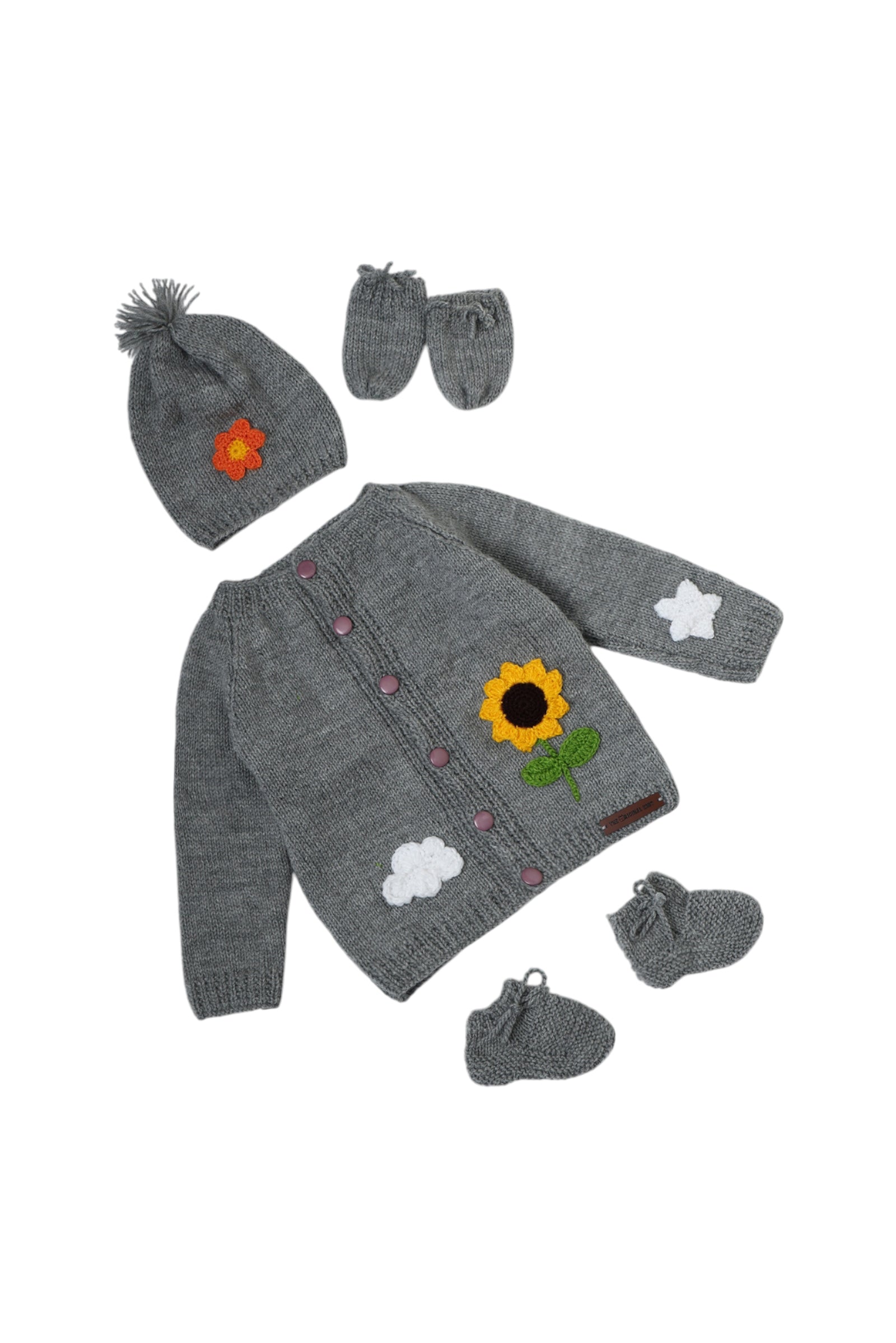 Inspired by soft skies and happy mornings, this four-piece handcrafted set brings together warmth, comfort, and storytelling through design. The sweater features a bright sunflower on one side and a gentle cloud on the other, symbolising sunshine after softness — just like a baby’s world of little wonders. A tiny star stitched on the sleeve and a delicate flower on the cap complete the dreamy look.