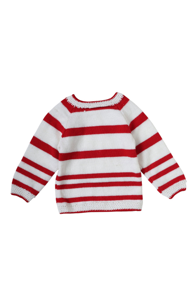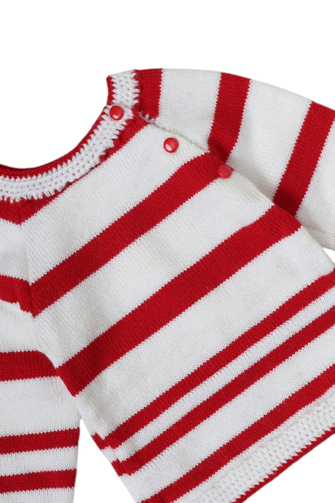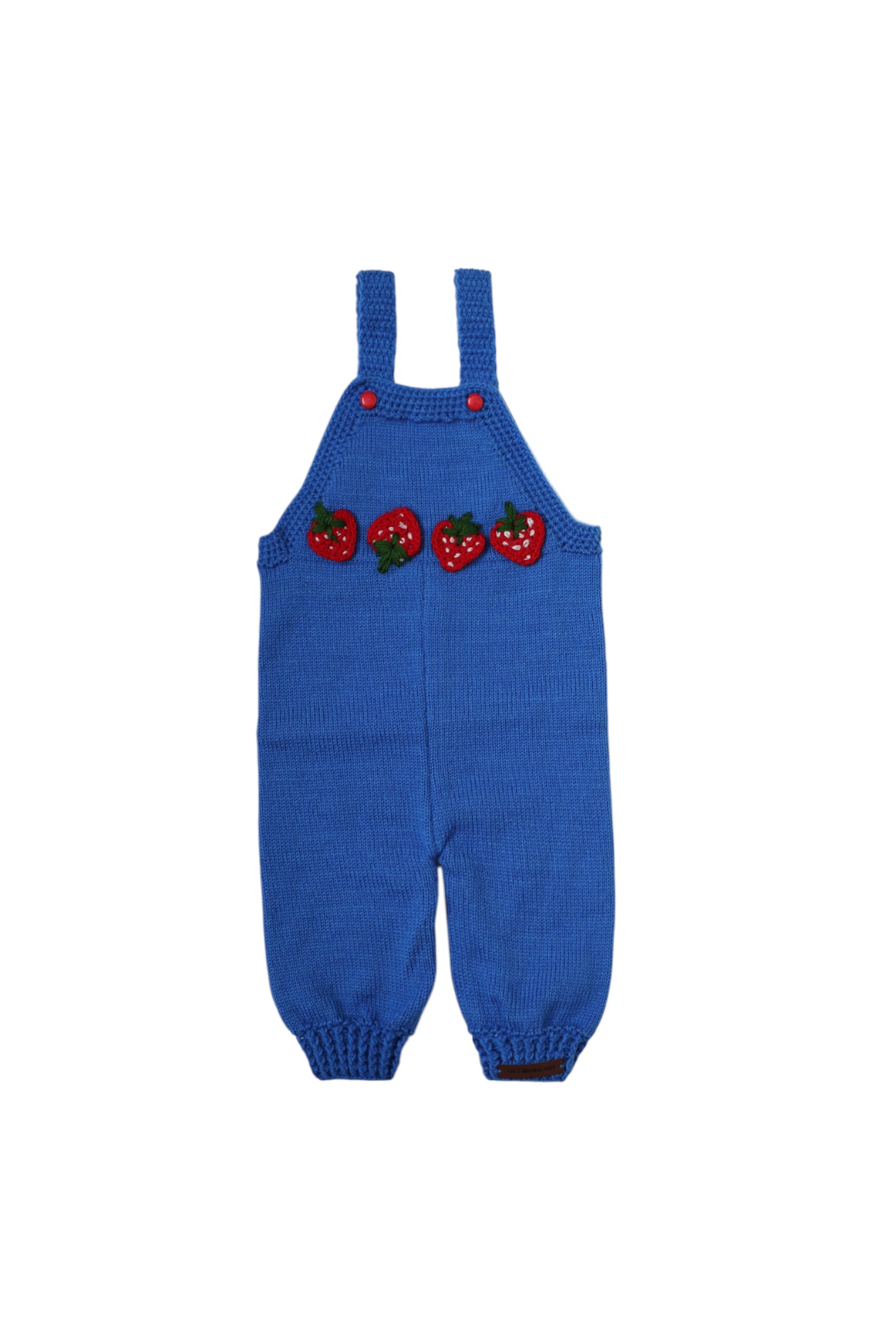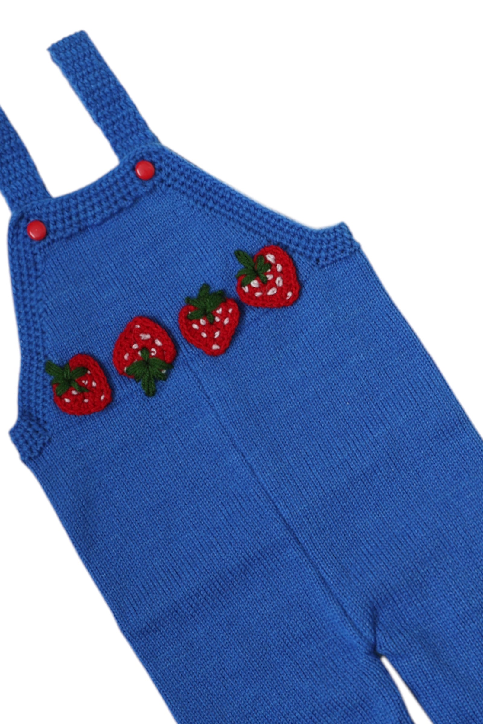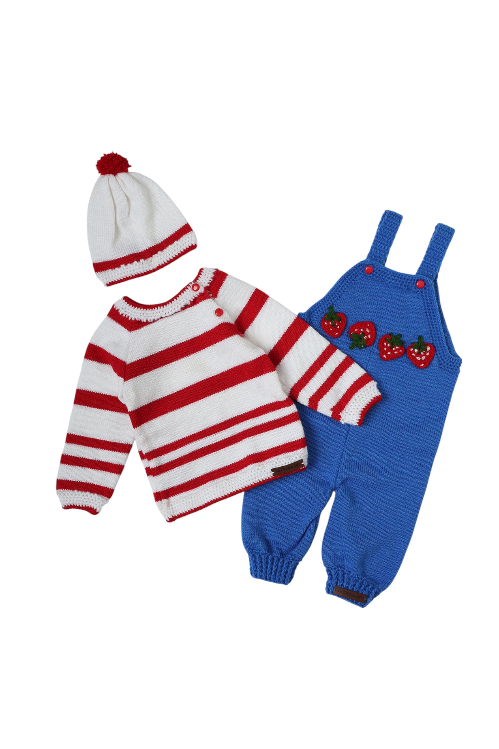 This charming dungaree set stands out with its bold, wide-striped blue and white pattern, inspired by vintage winter wear with a modern handcrafted twist. The centre features a cute hand-crocheted teddy face applique, adding a touch of personality and warmth. The dungaree is paired with a plain blue sweater for a neat, balanced look that keeps the focus on the craftsmanship and motif.