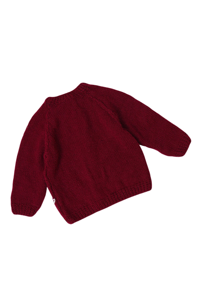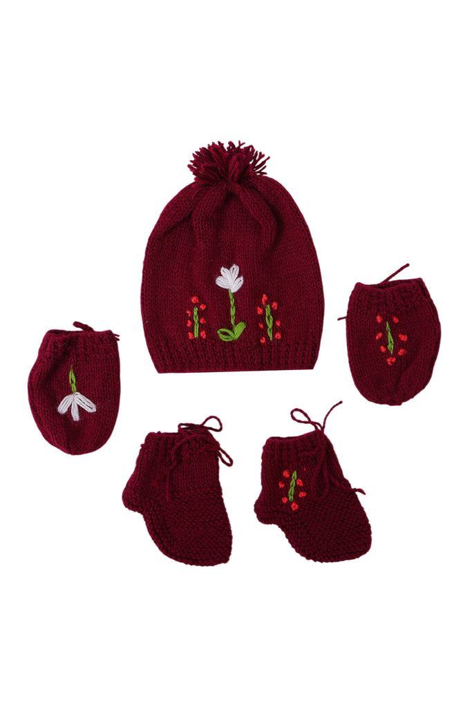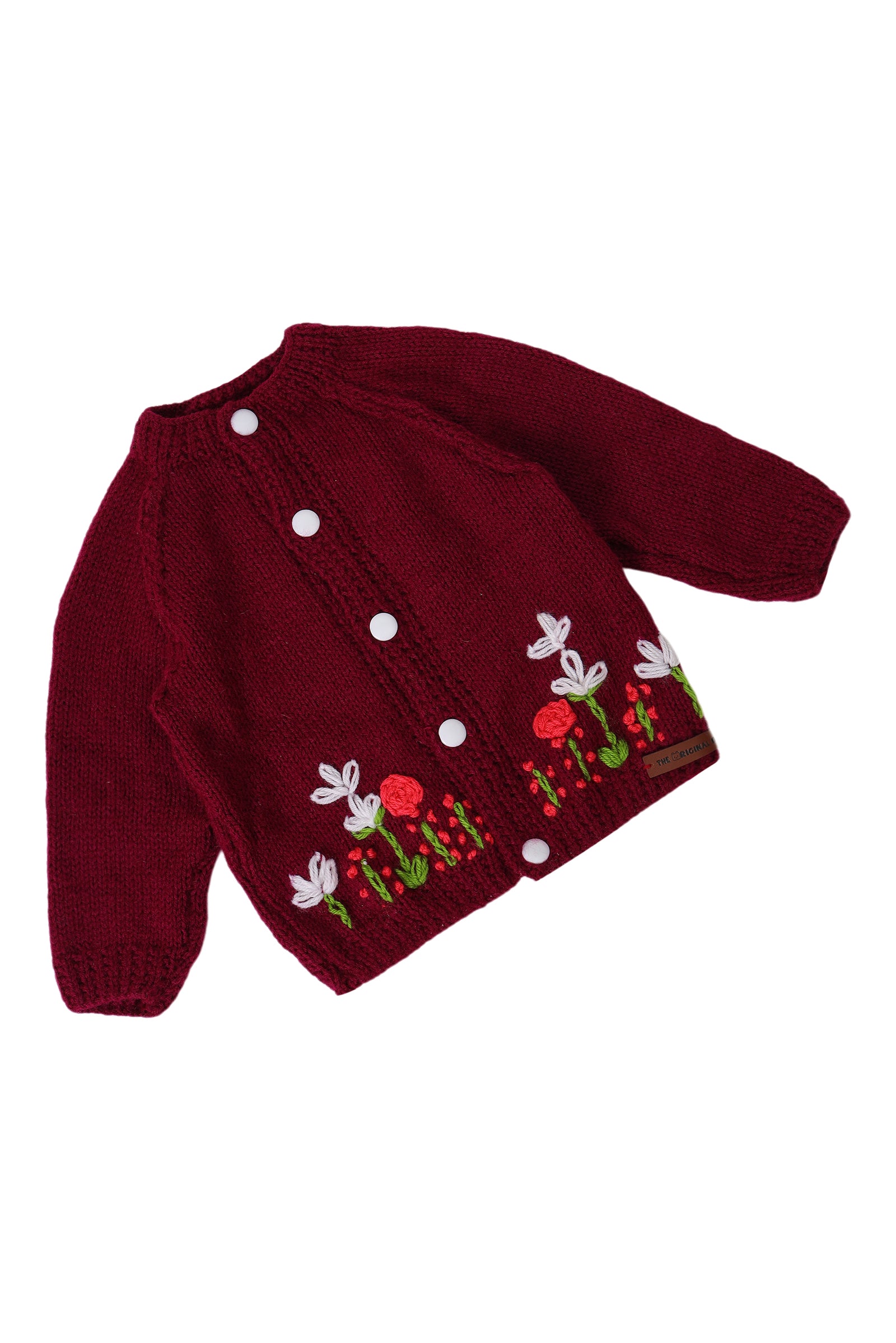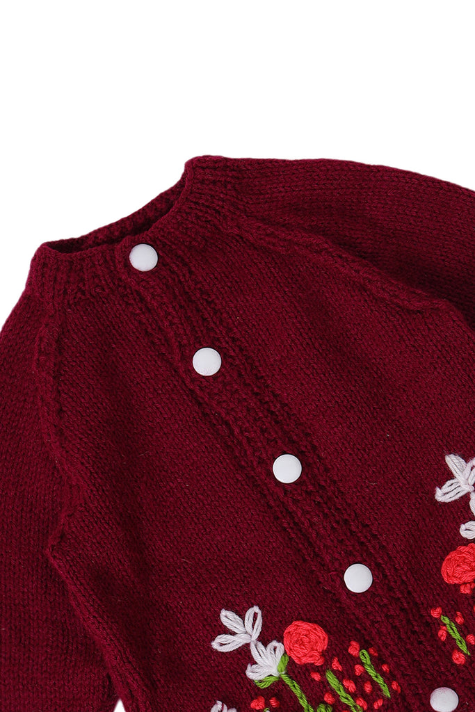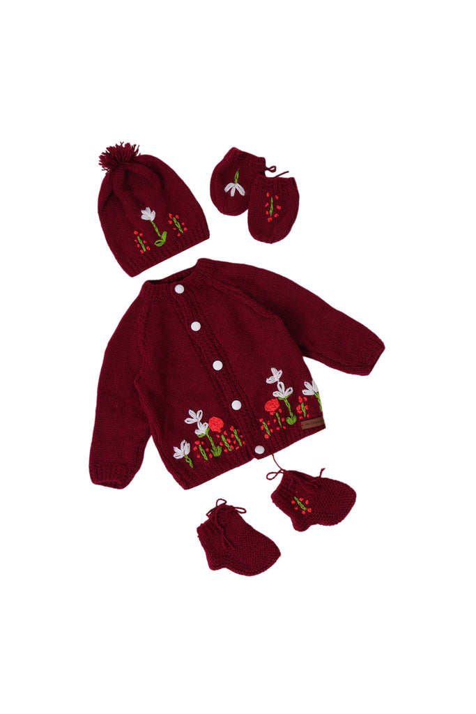 A timeless handcrafted treasure, this front-open baby sweater set is adorned with vibrant hand-embroidered florals on a rich burgundy base. Made with care by skilled artisans, it offers softness, warmth, and charm for your little one. Perfect for everyday wear or as a keepsake gift, this sweater set blends comfort with artisanal beauty.