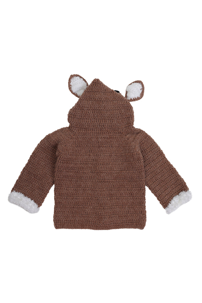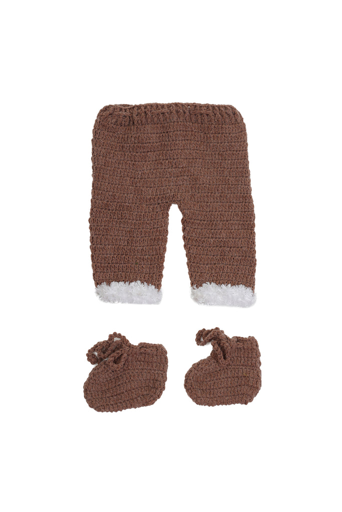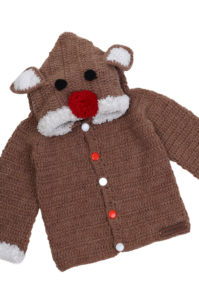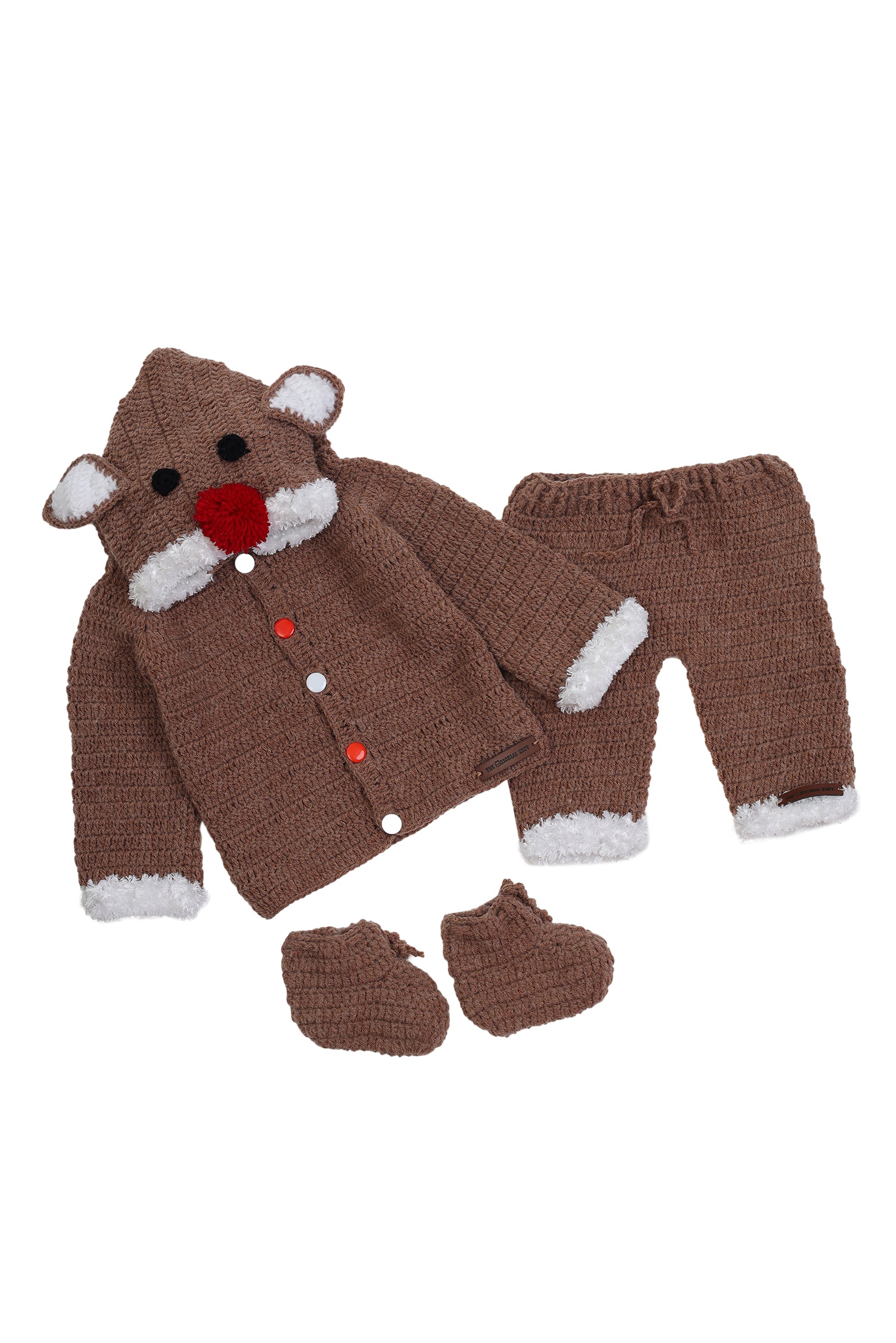 et the winter magic begin! This cozy woolen baby set in warm brown features an adorable reindeer design that’s perfect for chilly-day cuddles. Light fur trimming along the edges adds a soft, snuggly touch—like a warm hug on a frosty morning. Hand-knitted with love and winter adventures in mind, this set keeps your little one toasty while looking cute as ever. Ideal for holiday photos, stroller strolls, or gifting something extra special!