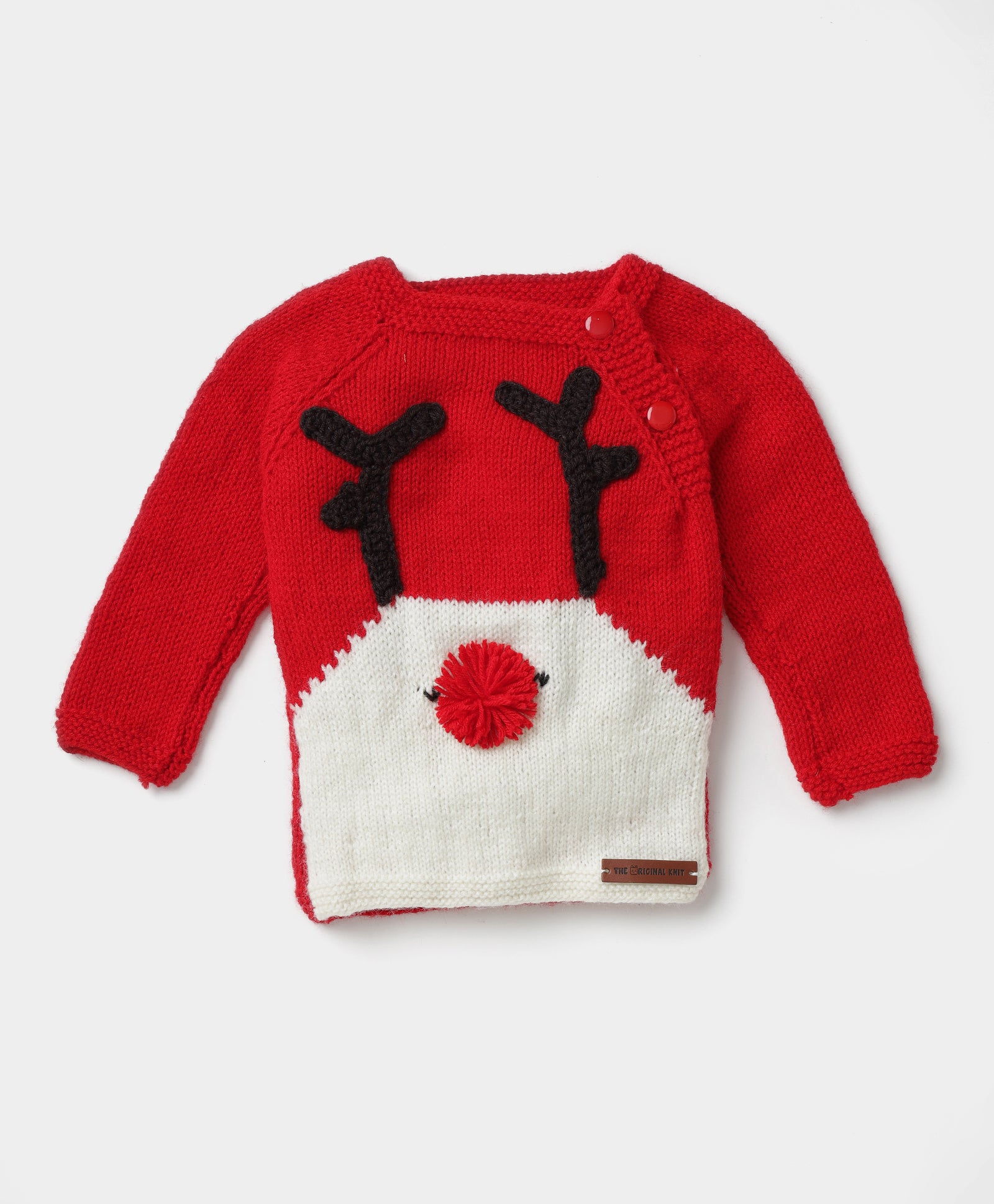 Red & White, Handmade Self Design Sweater Set with Cap & Socks, Sweater has a round neck, long sleeves, button closure, ribbed hem.