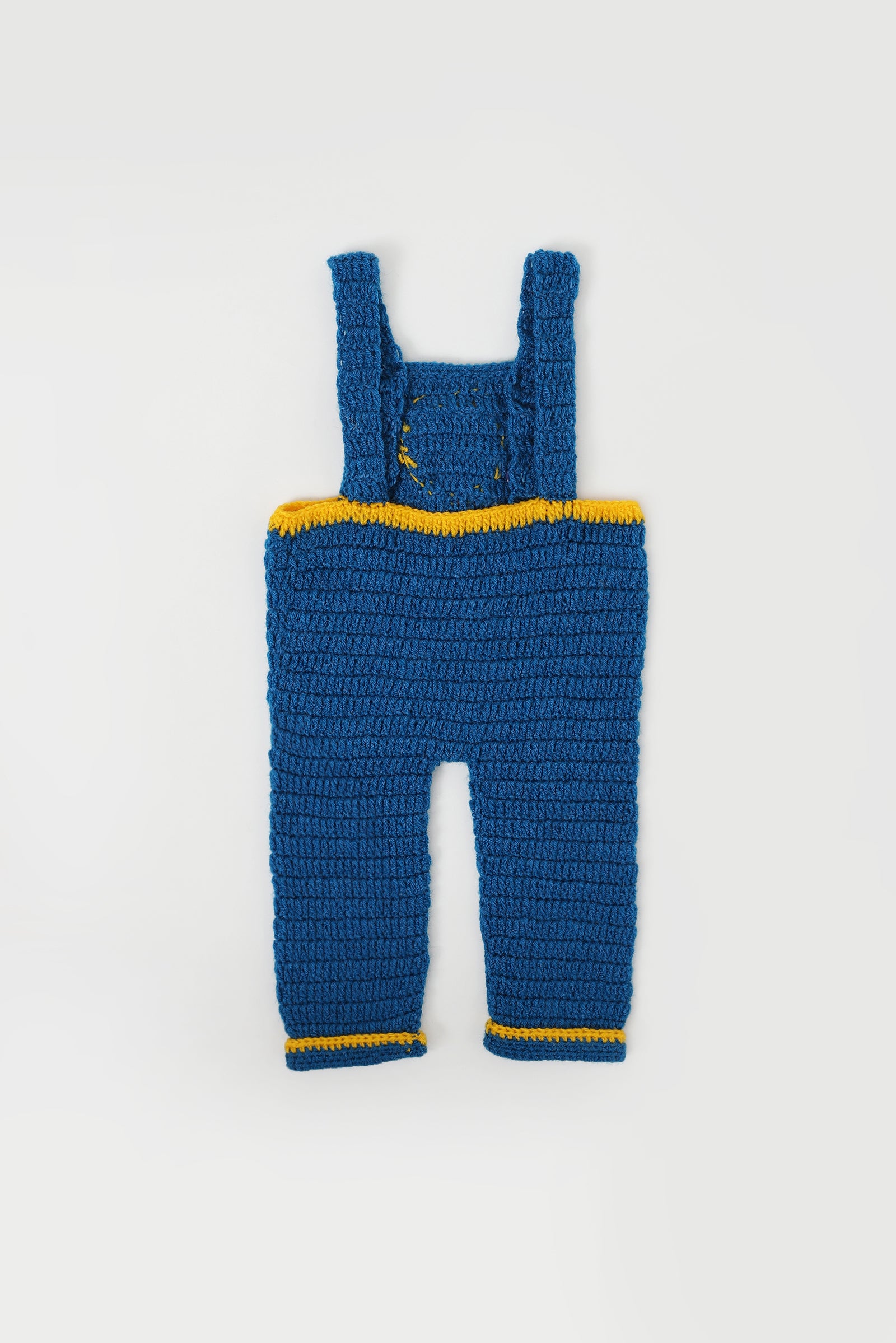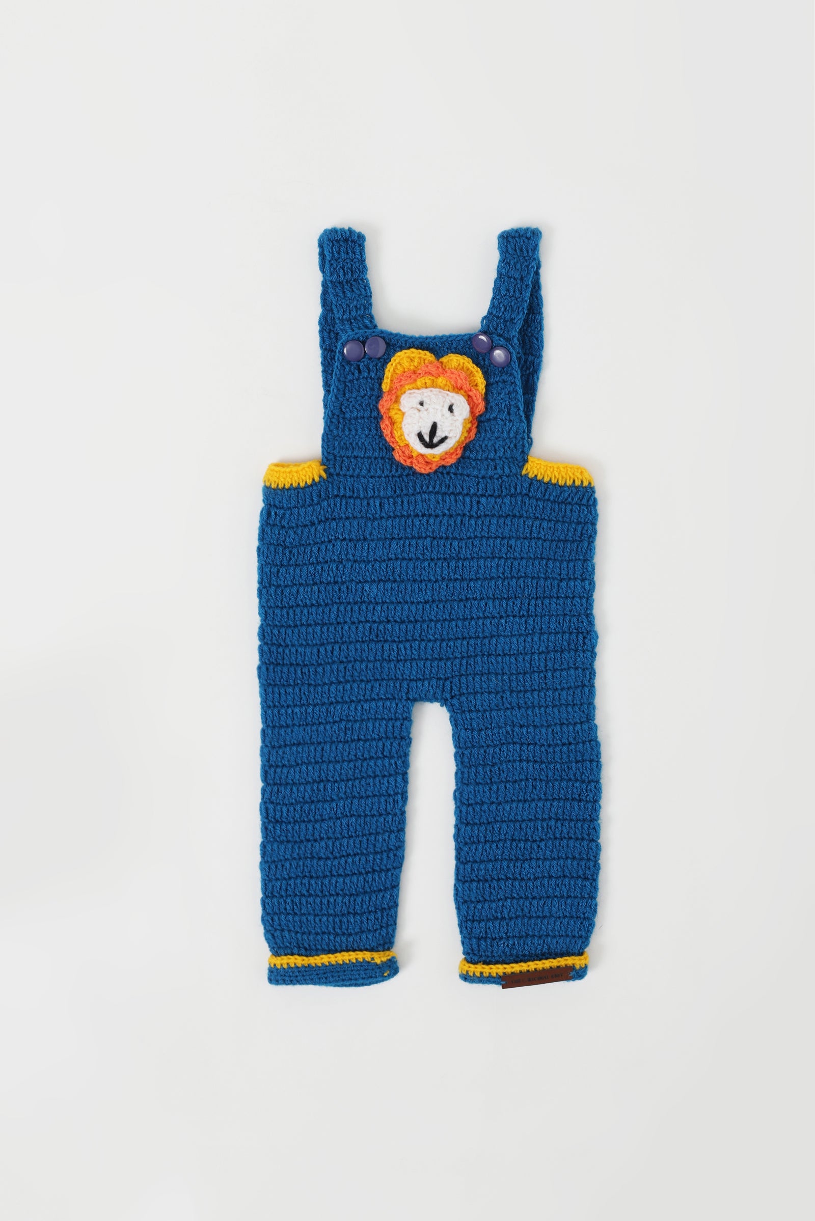 Handmade Royal Blue and Yellow Self-Design Dungaree, featuring a charming lion embellishment. This cozy set includes a matching cap and booties, perfect for keeping your little one warm and stylish. With a round neck and long sleeves, it's an ideal blend of comfort and cuteness.