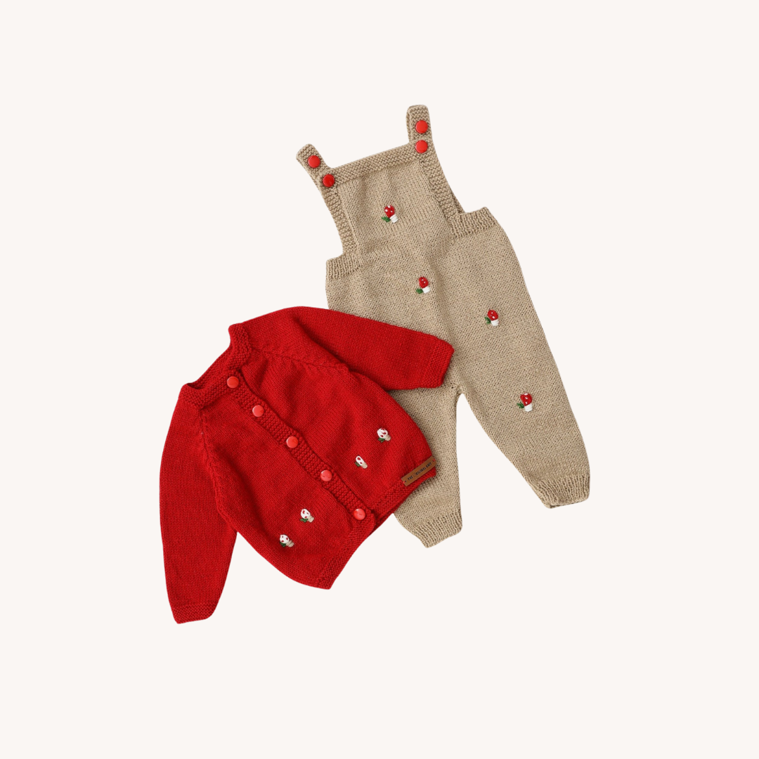 Introducing our adorable Magic Mushroom Dungaree Set! This charming set includes a cozy red sweater and a beige dungaree, all adorned with delightful mushroom embellishments. Perfect for adding a touch of autumnal whimsy to your child's wardrobe, this outfit is hand crafted from soft, high-quality materials to ensure warmth and comfort. The playful design and coordinating pieces make it ideal for any fall outing or festive occasion. Let your little one shine in this enchanting Magic Mushroom Dungaree Set, a perfect blend of style and coziness!
