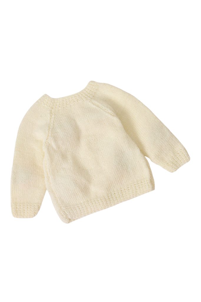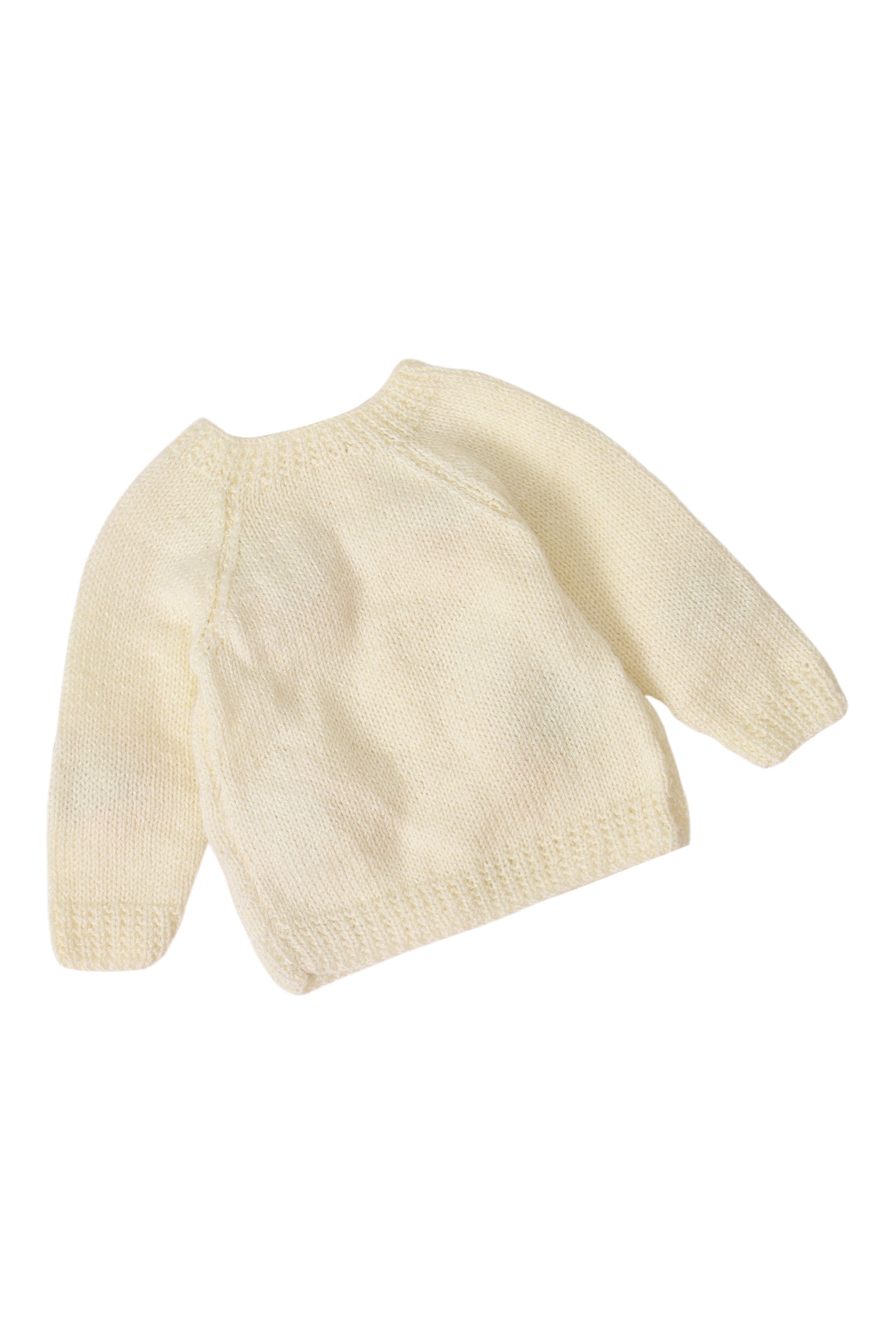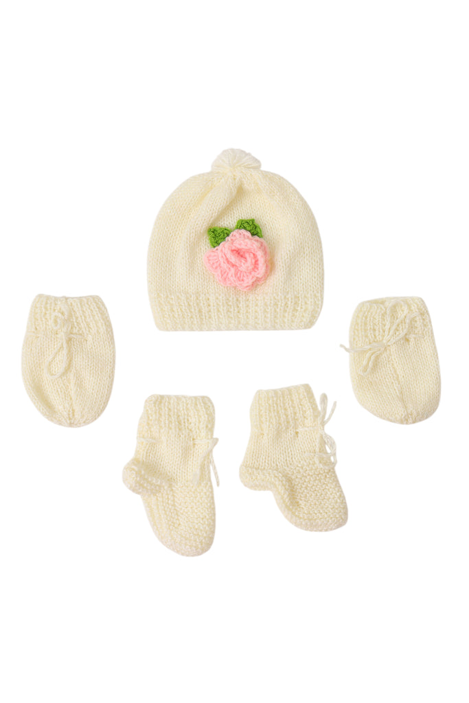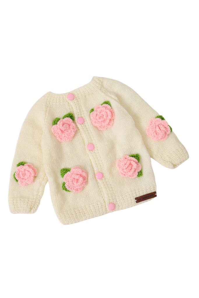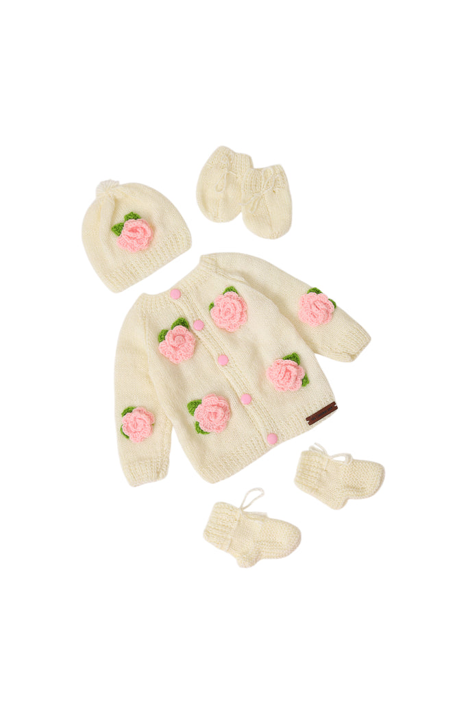 Delicate and dreamy, this handmade cream front-open baby sweater set is adorned with soft baby pink crochet roses, adding a gentle touch of sweetness. Crafted with love by artisans, it’s lightweight, cozy, and perfect for your little one’s first winters. The floral detailing against the neutral cream base makes it an elegant keepsake, ideal for everyday wear or gifting.