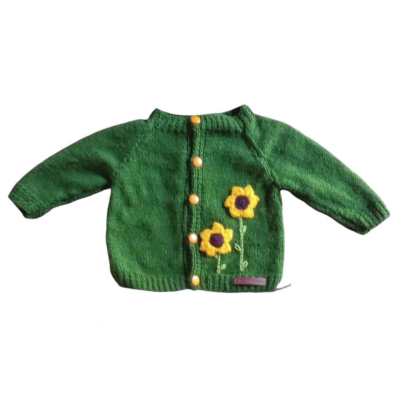 A cheerful hand-knitted sweater  featuring vibrant sunflower appliqués on one side of the sweater and a matching sunflower on the cap.