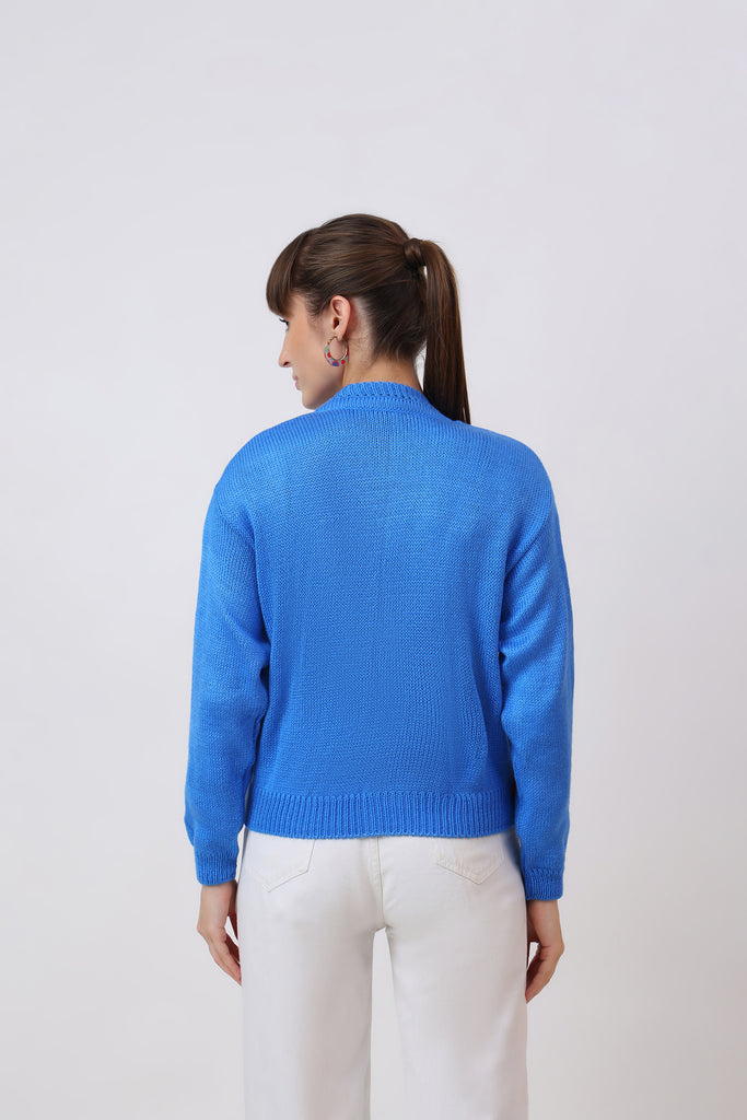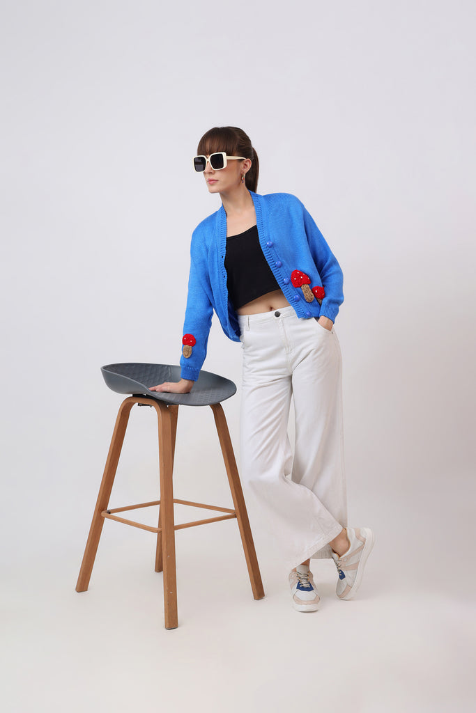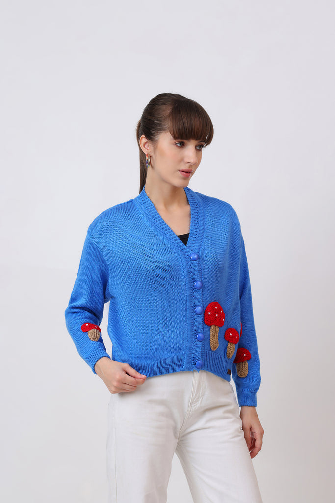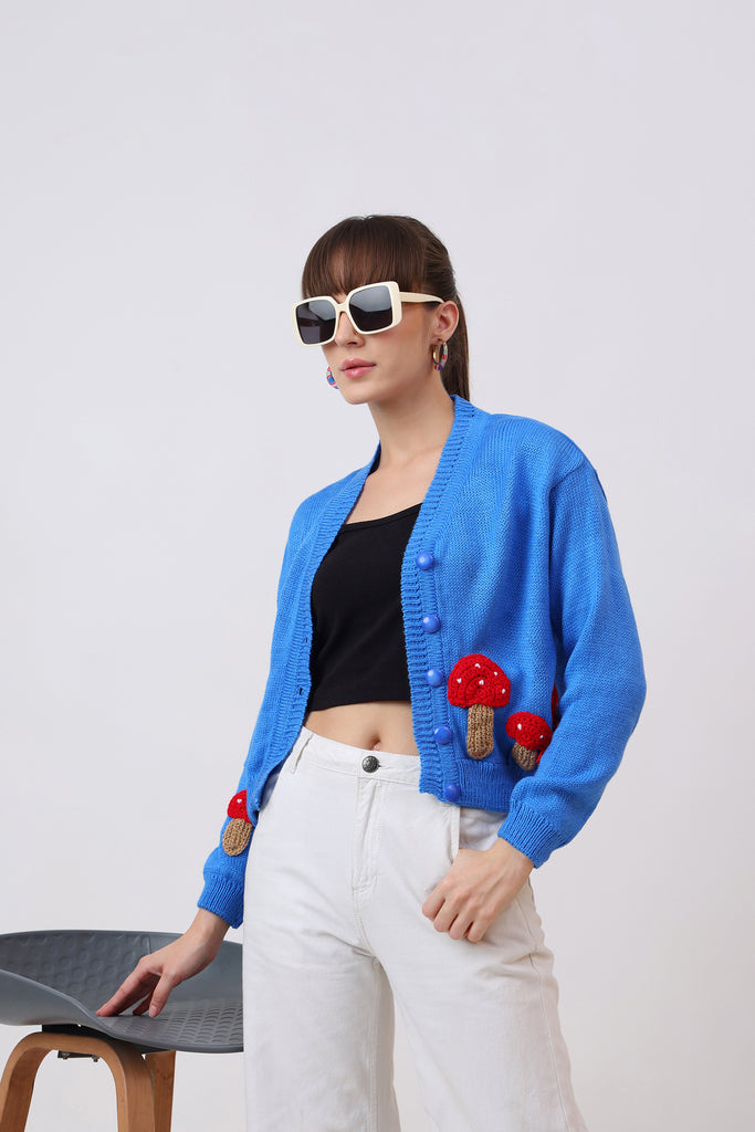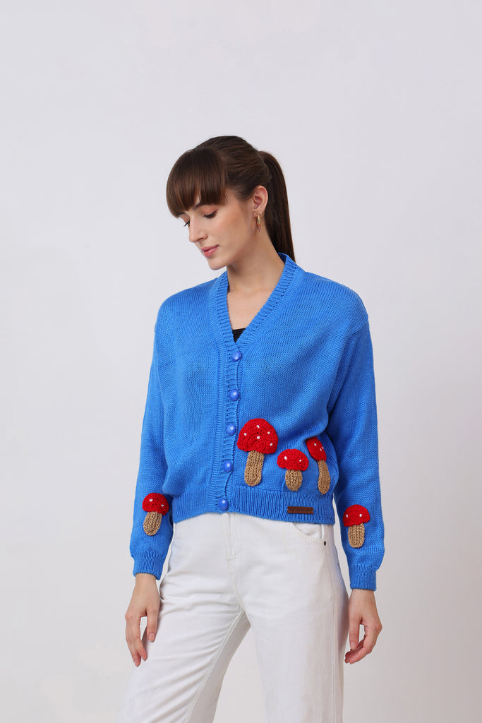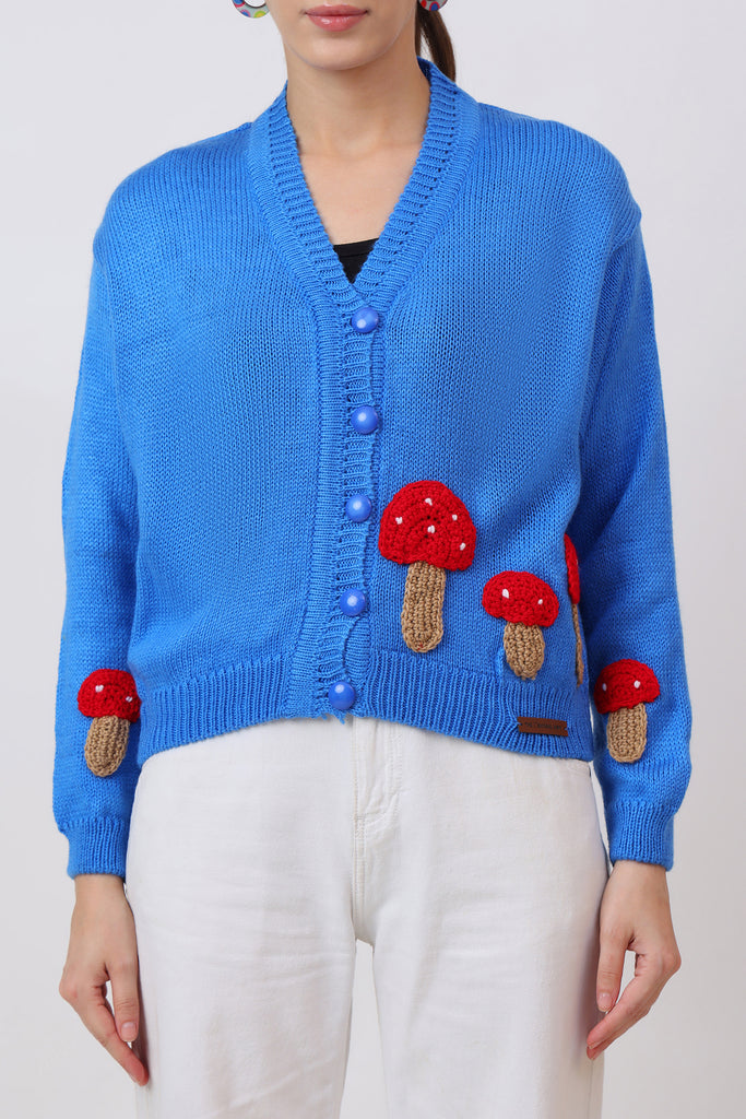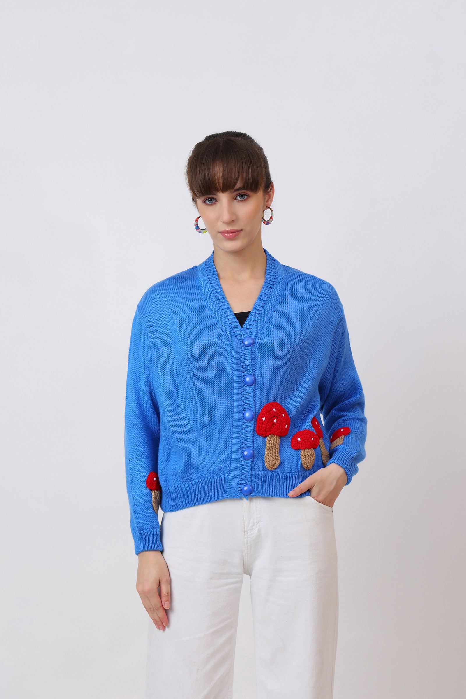 Step into whimsy with this blue adult cardigan, featuring charming crochet mushroom appliqués. The playful red-and-white details stand out against the deep blue base, creating a look that is both cozy and unique. Designed for comfort and style, this cardigan brings together artisanal craftsmanship with a touch of woodland charm — perfect for everyday wear or as a standout statement piece in your wardrobe.Material: 100% Acrylic Yarn Relaxed fit with full sleeves Front button closure for easy layering