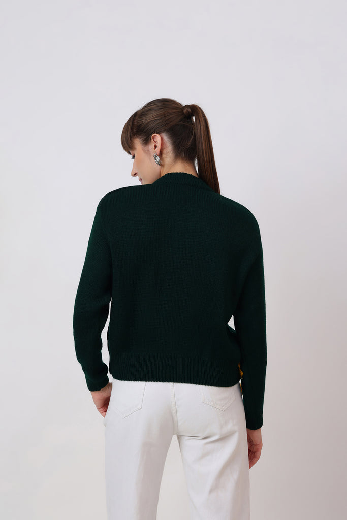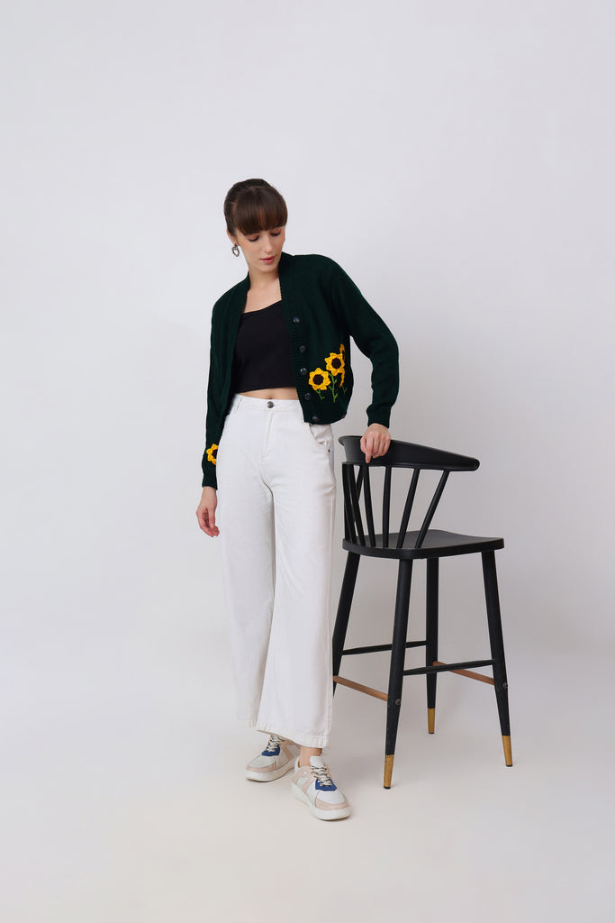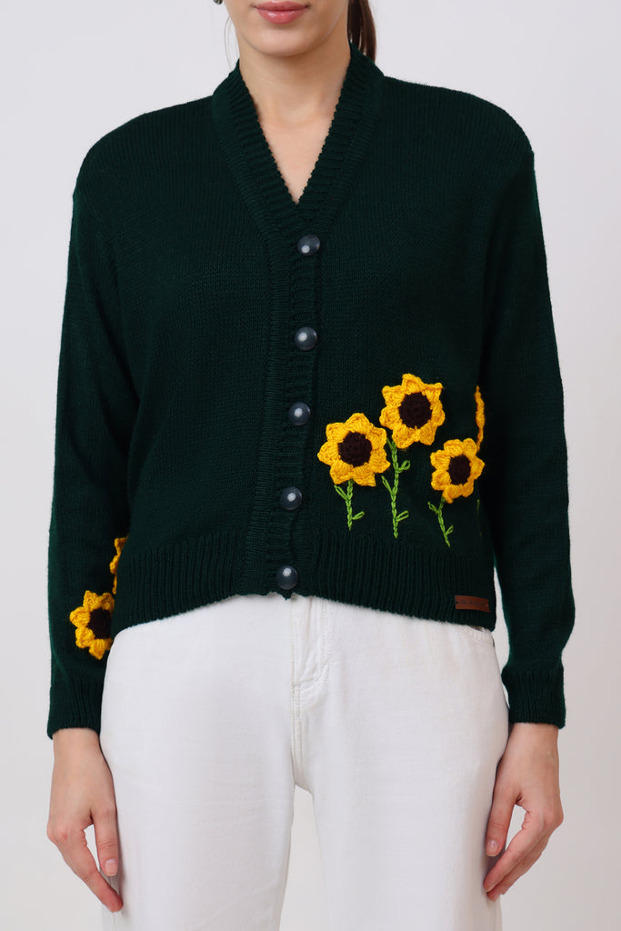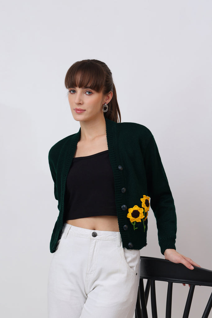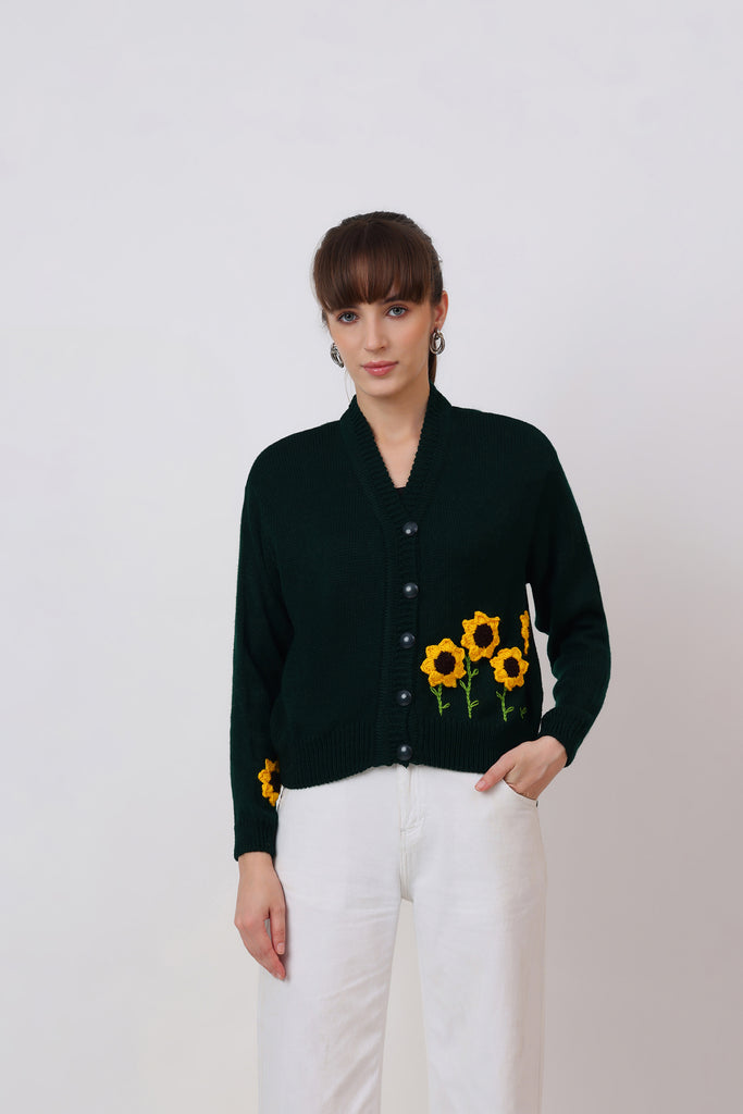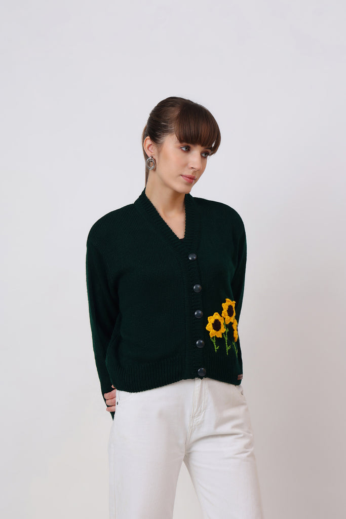 Bring a touch of sunshine to your wardrobe with this bottle green cardigan, beautifully adorned with bright sunflower crochet appliqués. The rich green base creates a striking contrast with the golden blooms, making it both eye-catching and elegant. Crafted with love and care, this cardigan is cozy, versatile, and perfect for adding a cheerful twist to your everyday style. A timeless piece that combines comfort, artistry, and charm.