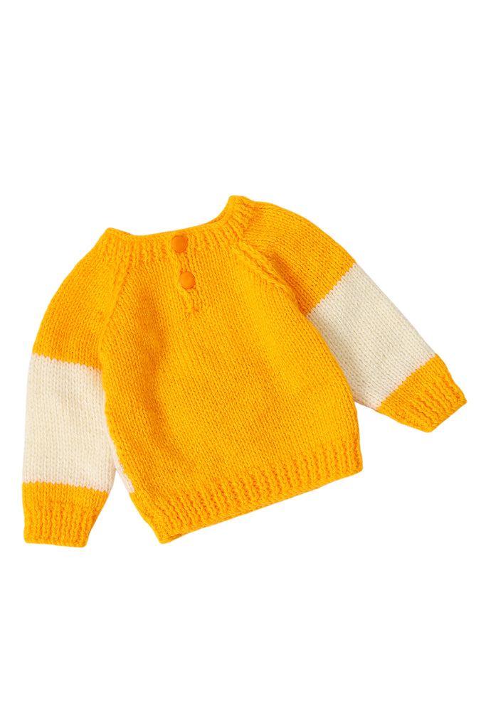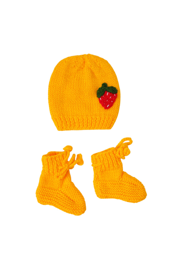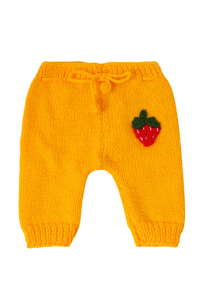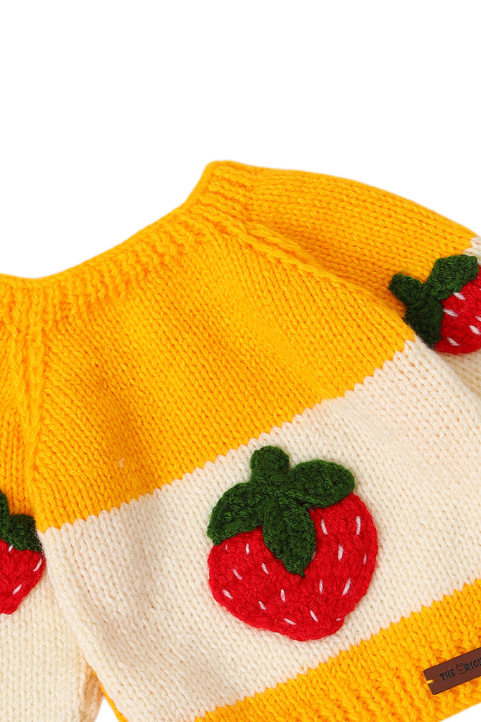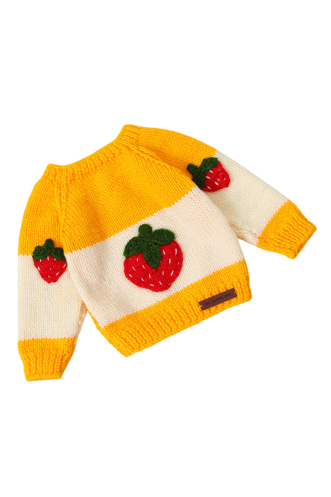 Bright and playful, this cream and yellow handmade baby sweater set with pajama features a bold red strawberry crochet appliqué at the center, adding a fun and cheerful twist. Soft, cozy, and lovingly crafted by artisans, this set is perfect for keeping your little one warm while looking irresistibly cute. A sweet keepsake that blends comfort, colour, and charm — just right for everyday wear or gifting.