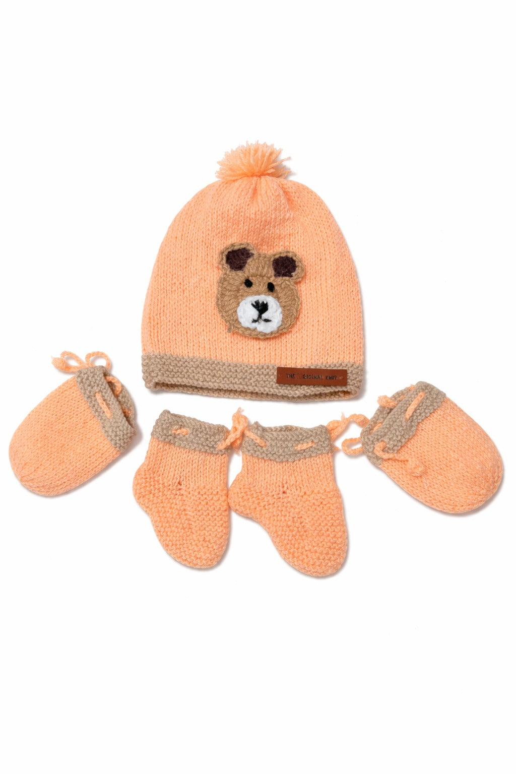 Pack of 3 Peach Handmade Teddy Cap, Mittens & Socks.