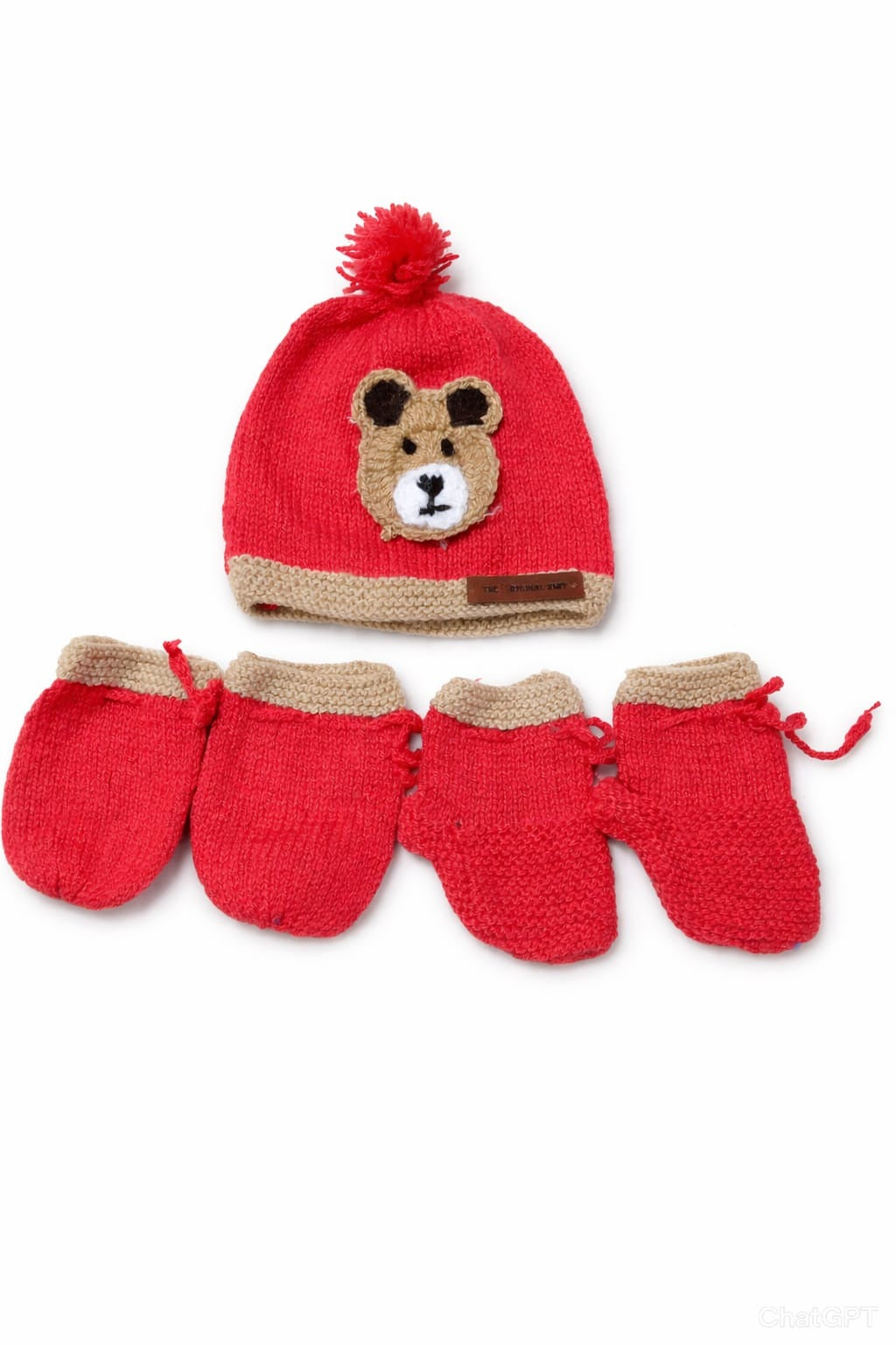 Pack of 3 Red Handmade Teddy Cap, Mittens & Socks.