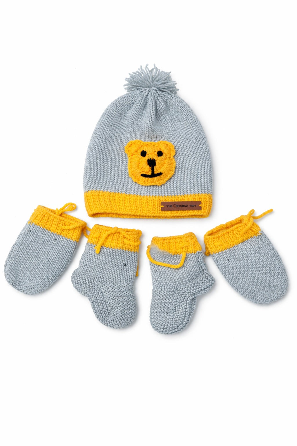 Unisex Handmade Cap With Socks & Mittens- Grey & Yellow