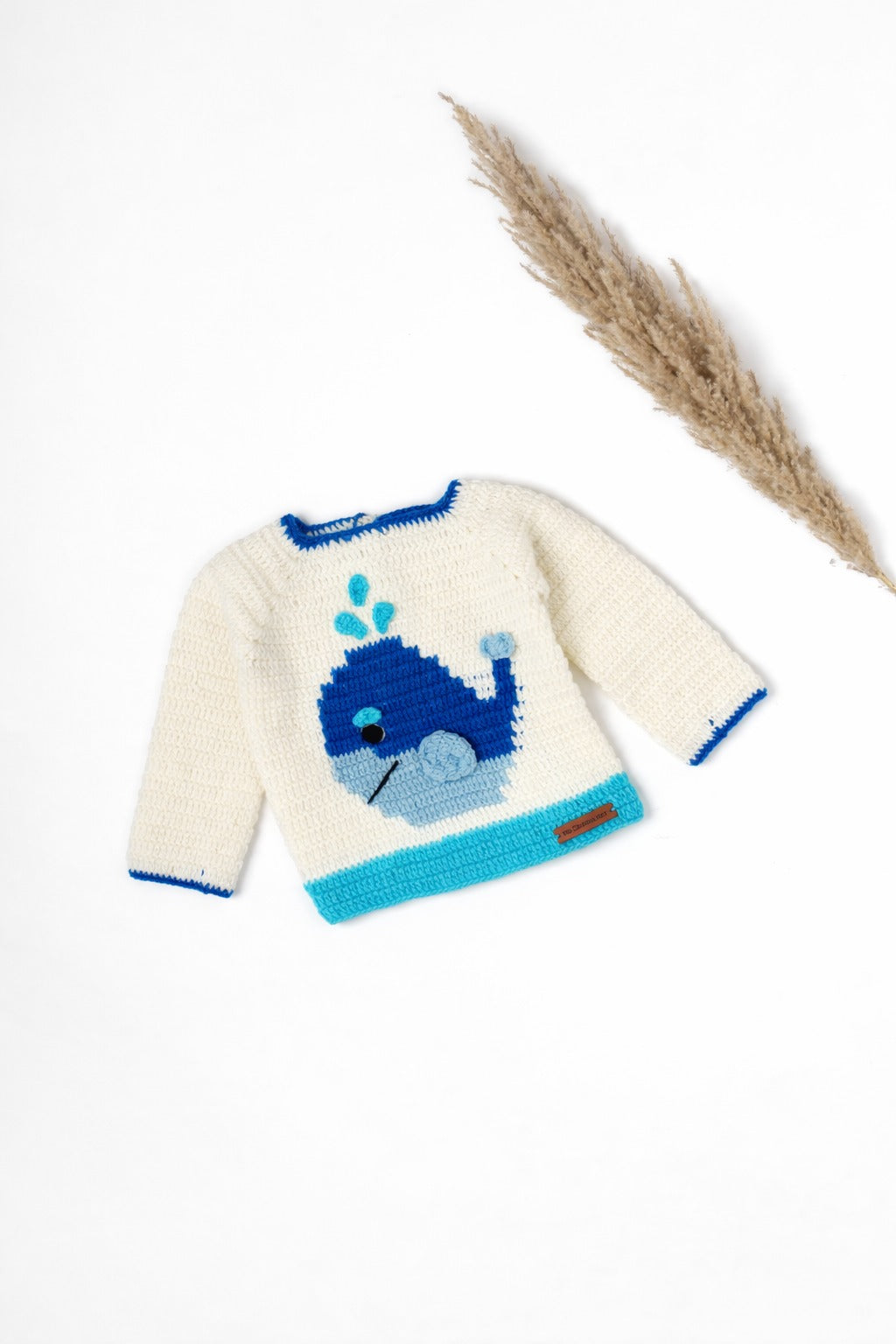 A delightful off-white ensemble featuring a charming blue border and embellished with an adorable whale. This cozy set is perfect for your little one, offering both comfort and nautical style. Ideal for keeping your baby warm while adding a touch of marine whimsy to their wardrobe.